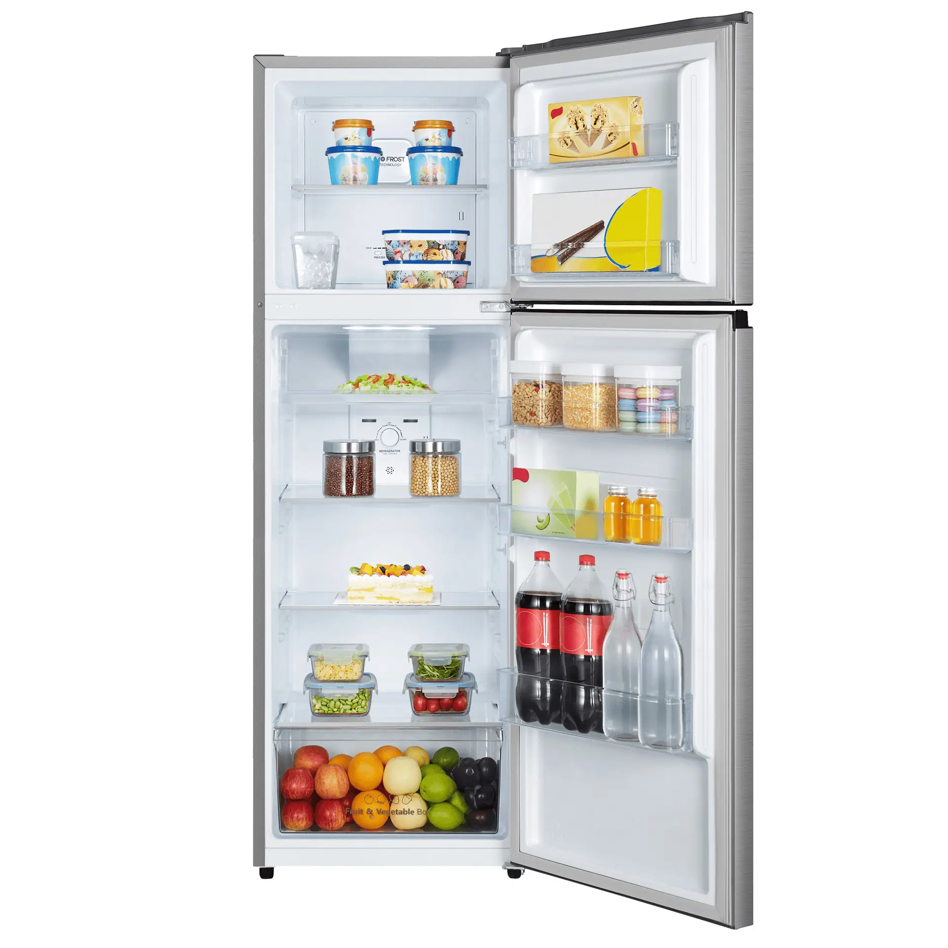 Hisense RT327N4ACF. Capacità netta totale: 249 L. Cerniera porta: Destra. Classe climatica: N-ST, Emissione acustica: 42 dB. Capacità netta frigorifero: 197 L, Luce interna, Numero di ripiani frigorifero: 5, Numero di cassetti per verdura: 1. Capacità netta congelatore: 52 L, Capacità di congelamento: 2 kg/24h. Classe efficienza energetica: F, Consumo energetico annuo: 241 kWh. Colore del prodotto: Metallico