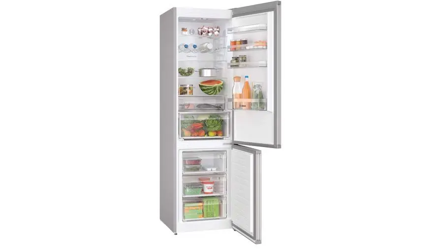 Bosch Serie 4 KGN397LDF. Capacità netta totale: 260 L. Cerniera porta: Destra. Classe climatica: SN-T, Emissione acustica: 35 dB. Capacità netta frigorifero: 103 L, No Frost (frigorifero), Sistema Multi-Airflow (frigorifero), Luce interna. Capacità netta congelatore: 103 L, Capacità di congelamento: 9,5 kg/24h, No Frost (congelatore). Compartimento zona fresca. Classe efficienza energetica: D, Consumo energetico annuo: 203 kWh. Colore del prodotto: Acciaio inossidabile