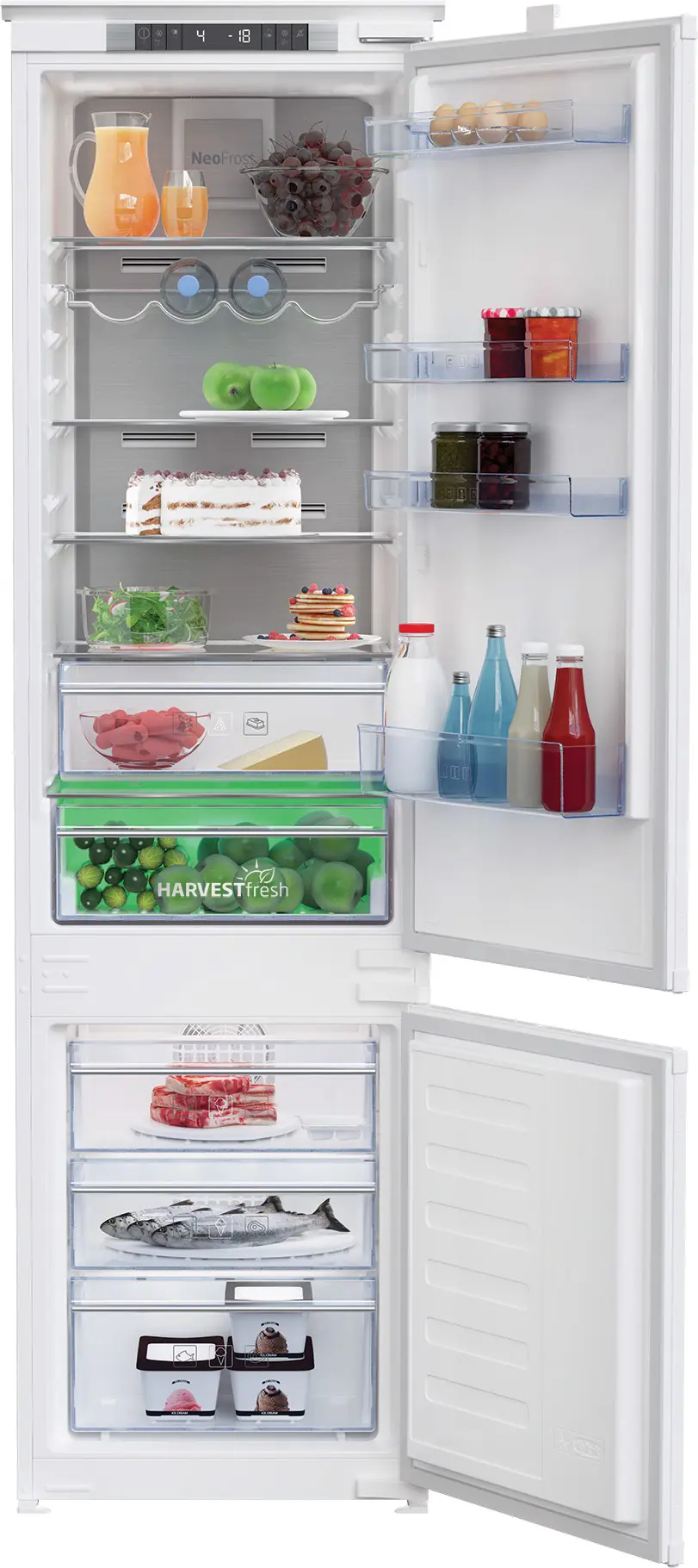 Beko BCNA306E4SN. Posizionamento dell'apparecchio: Da incasso, Colore del prodotto: Bianco, Cerniera porta: Destra. Capacità netta totale: 306 L, Classe climatica: SN-T, Classe emissione rumore: C. Capacità netta frigorifero: 215 L, Tipo di lampada: LED. Posizione del congelatore: Posto in basso, Capacità netta congelatore: 69 L, Capacità di congelamento: 3,2 kg/24h. Classe efficienza energetica: E, Consumo energetico annuo: 223 kWh, Scala di efficienza energetica: Da A a G