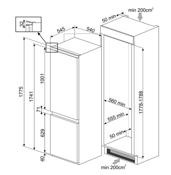 Smeg C3170NF. Capacità netta totale: 262 L. Cerniera porta: Destra. Classe climatica: SN-ST, Emissione acustica: 38 dB. Capacità netta frigorifero: 193 L, Luce interna, Numero di ripiani frigorifero: 3, Numero di cassetti per verdura: 1. Capacità netta congelatore: 69 L, Capacità di congelamento: 3,5 kg/24h, No Frost (congelatore). Compartimento zona fresca. Classe efficienza energetica: F. Colore del prodotto: Bianco