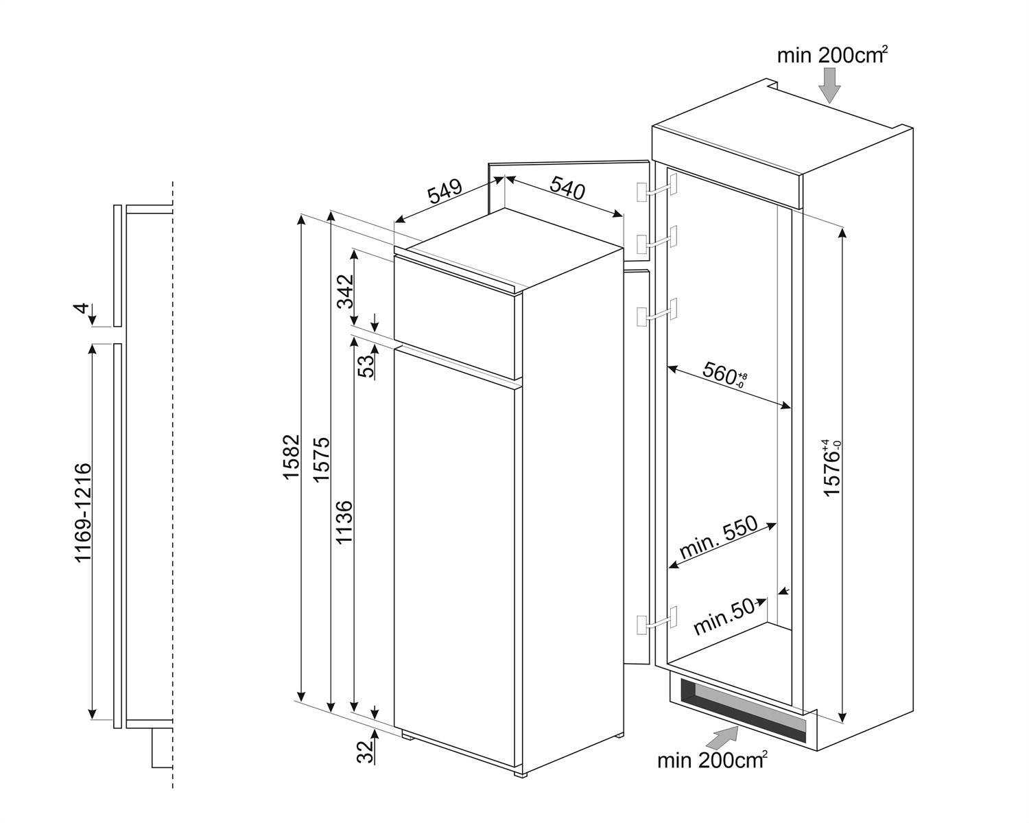 Smeg D4152F. Capacità netta totale: 259 L. Cerniera porta: Destra, Tipo di display: LED. Classe climatica: SN-T, Emissione acustica: 34 dB. Capacità netta frigorifero: 209 L, Luce interna, Numero di ripiani frigorifero: 4, Numero di cassetti per verdura: 1. Capacità netta congelatore: 50 L, Capacità di congelamento: 3 kg/24h. Classe efficienza energetica: E, Consumo energetico annuo: 193 kWh. Colore del prodotto: Bianco