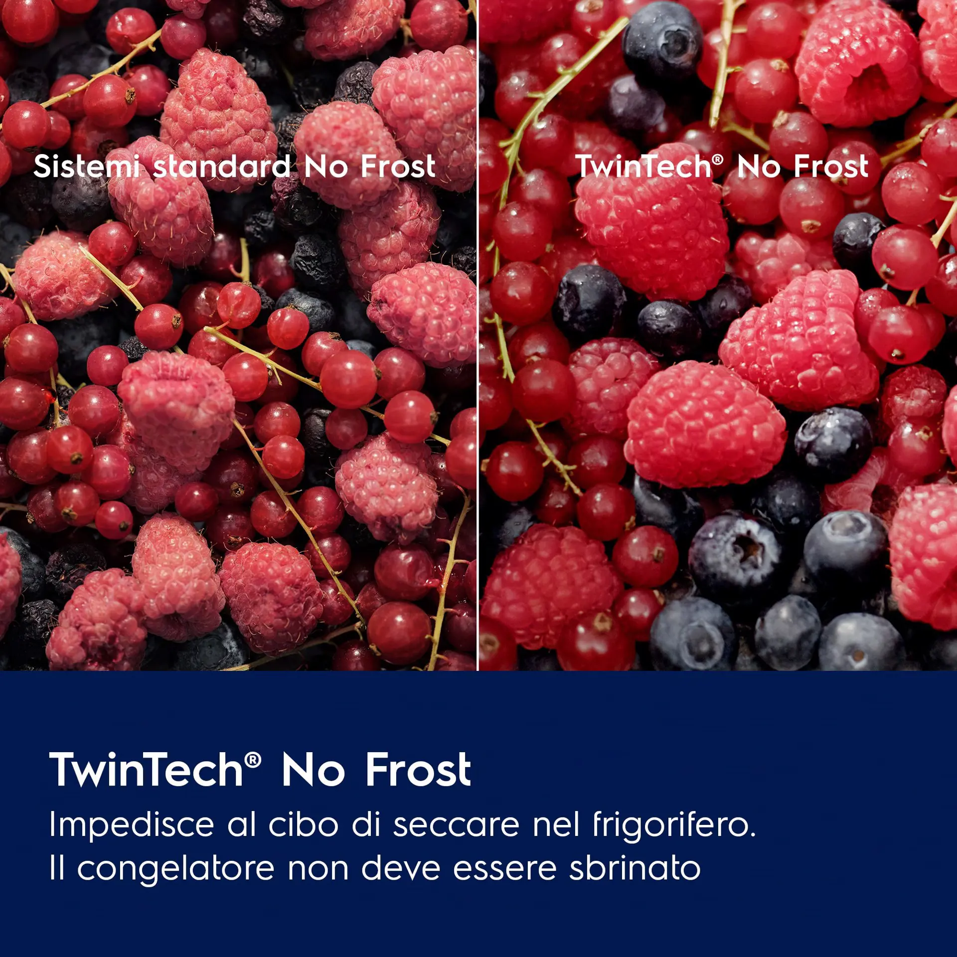TwinTech® Total No Frost è dotato di un avanzato sistema di raffreddamento doppio per il frigorifero e il congelatore. Questa tecnologia garantisce che il congelatore rimanga al riparo dal gelo e che l'umidità del frigorifero sia ottimale, evitando che gli alimenti si secchino.