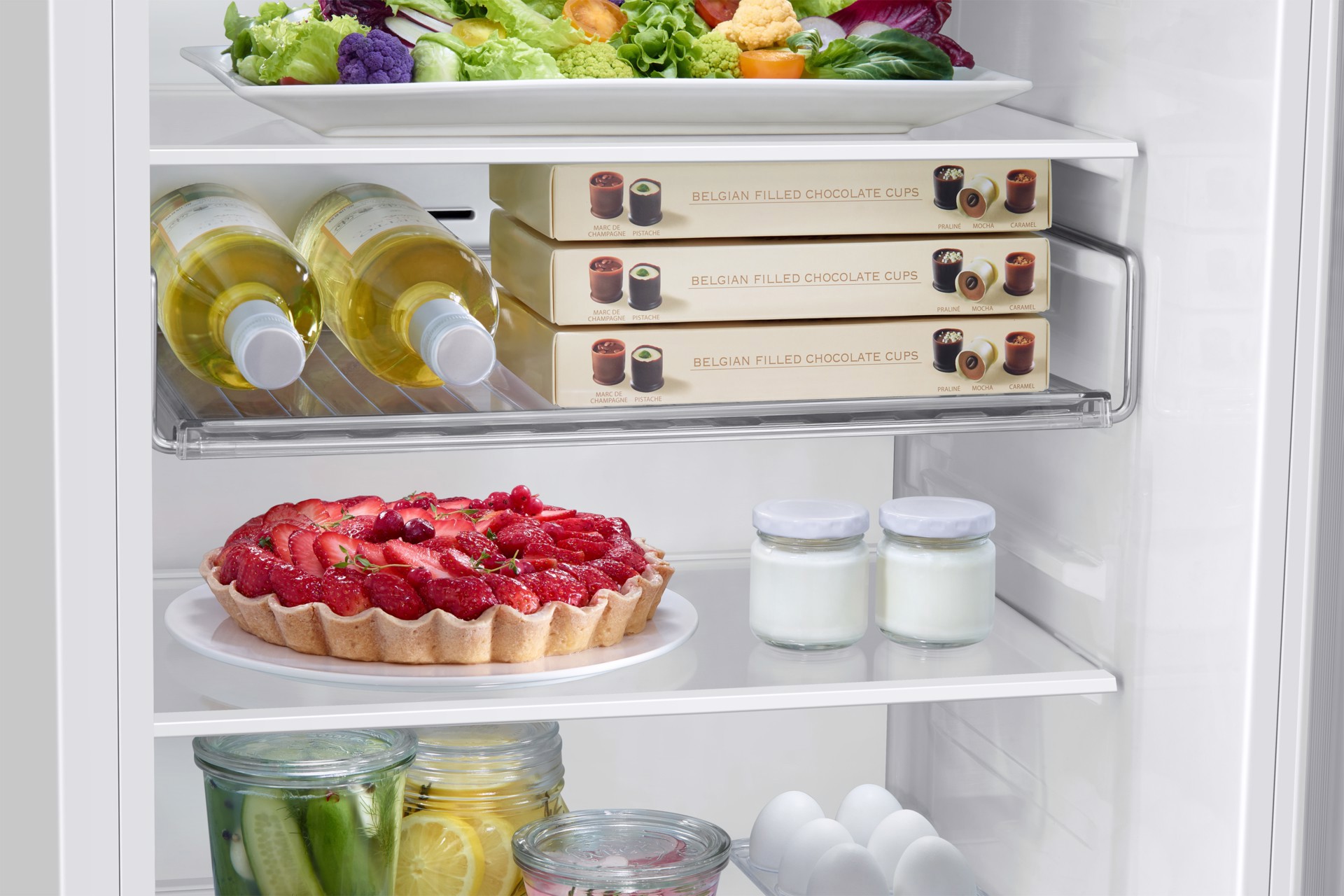 Un ripiano per vino multifunzionale che consente di sfruttare al meglio lo spazio del frigorifero. Grazie alla sua maggior larghezza può ospitare non solo bottiglie di vino di dimensioni standard ma anche più grandi, come quelle dello champagne. Una forma più piatta lo rende anche molto più versatile e adatto a contenere altri alimenti, ad esempio le pizze o i cartoni delle uova.