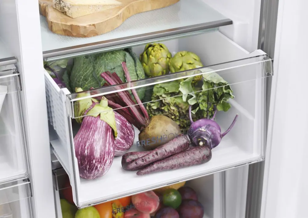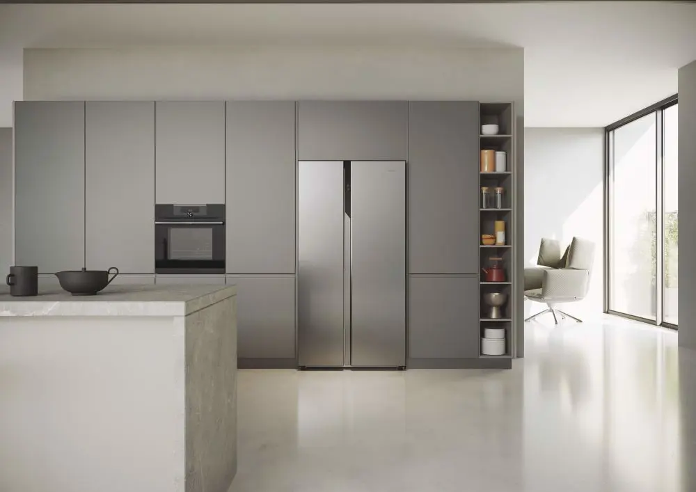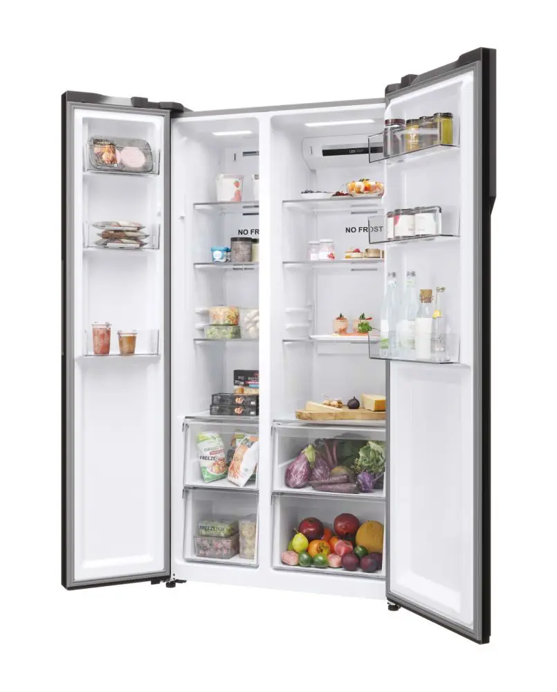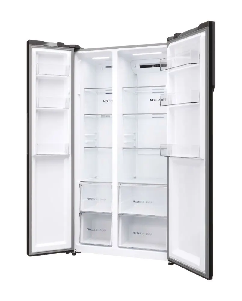 Haier SBS 90 Serie 5 HSR5918DNMP, Libera installazione, Porta americana, Platino, Acciaio inossidabile, Touch, Sulla porta, Vetro