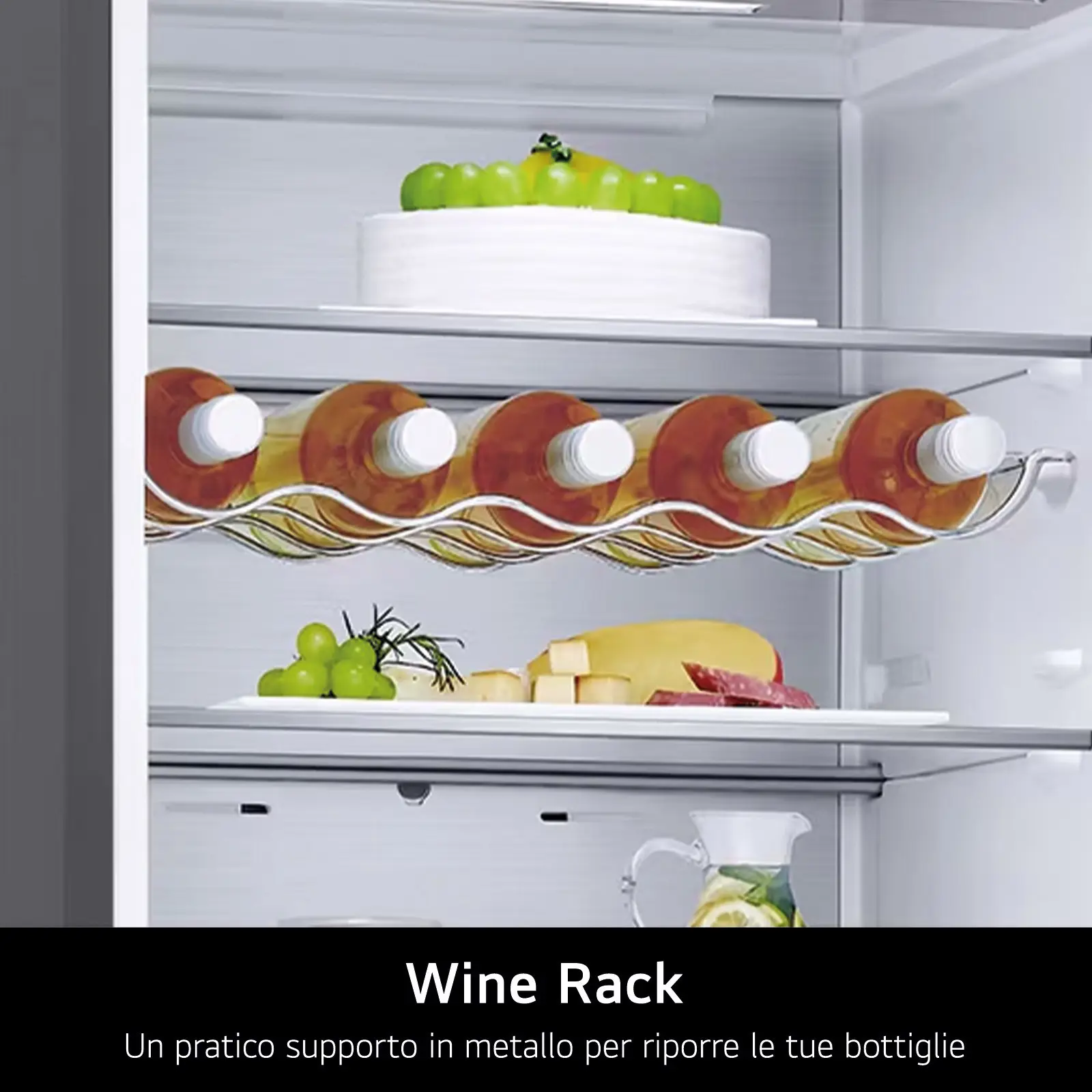 Se sei amante del vino e a casa tua non mancano mai delle bottiglie in fresco, il Wine Rack è un accessorio irrinunciabile. Si tratta di un supporto in metallo sagomato per organizzare e tenere in fresco le tue bottiglie di vino, disposte parallelamente agli altri ripiani. Il supporto per le bottiglie è rimovibile qualora ti servisse più spazio all'interno del frigorifero.