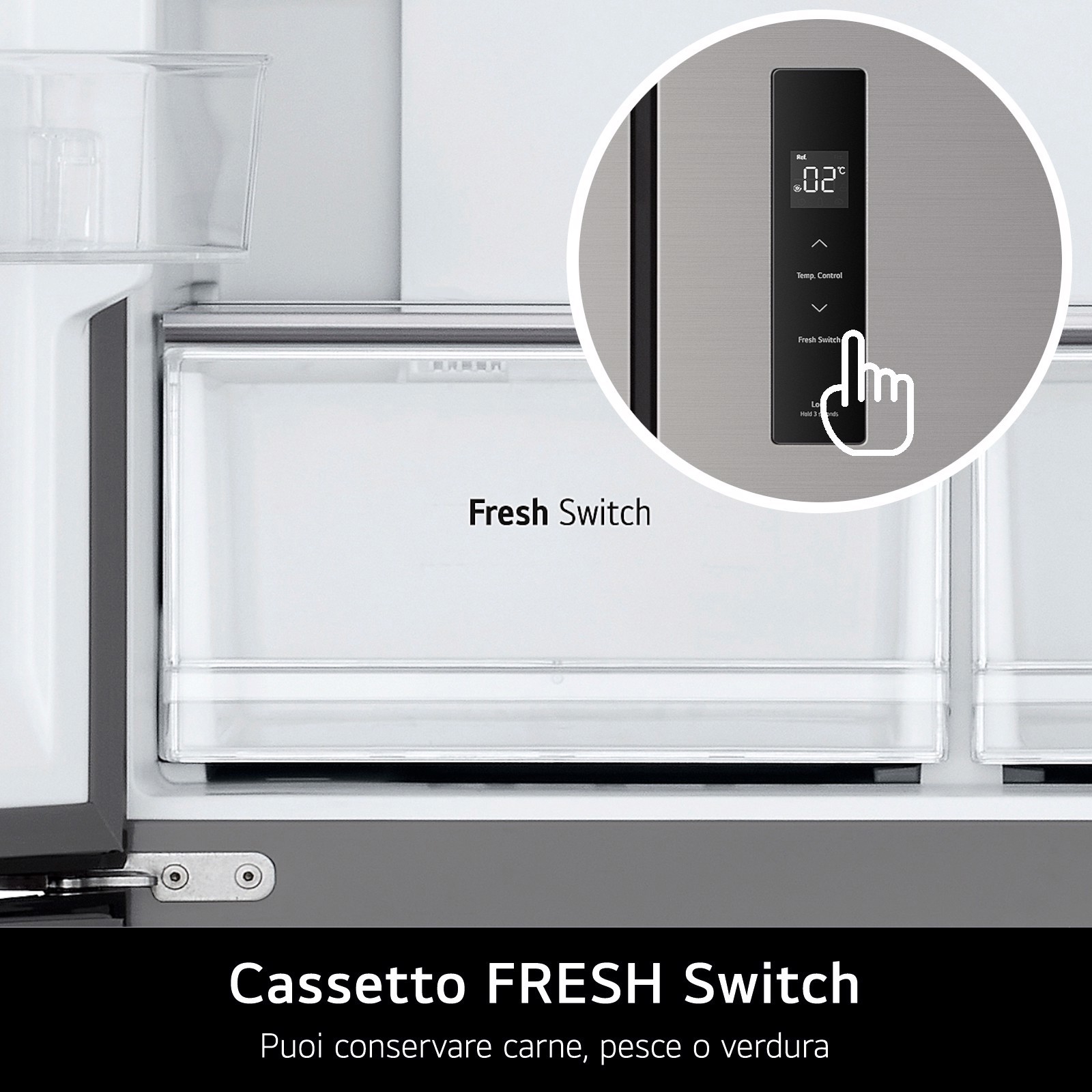 Puoi impostare la temperatura del cassetto zero gradi convertibile in base a ciò che vuoi conservare. Ti basta premere il tasto FRESH Switch sul display esterno e selezionare una delle opzioni fra carne e pesce (temperatura intorno a 0°C), frutta e verdura oppure bevande e cibi secchi. In questo modo puoi conservare qualunque alimento e gestire gli spazi nel frigorifero con più versatilità.