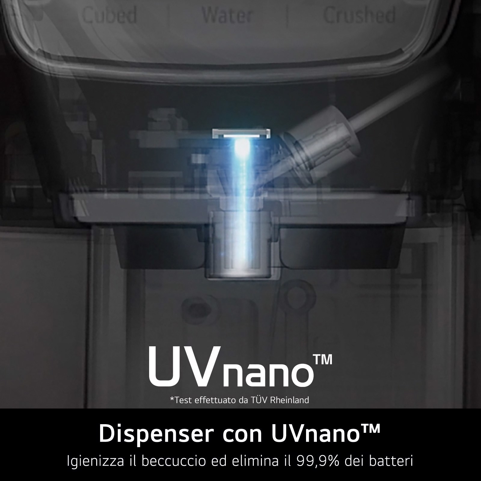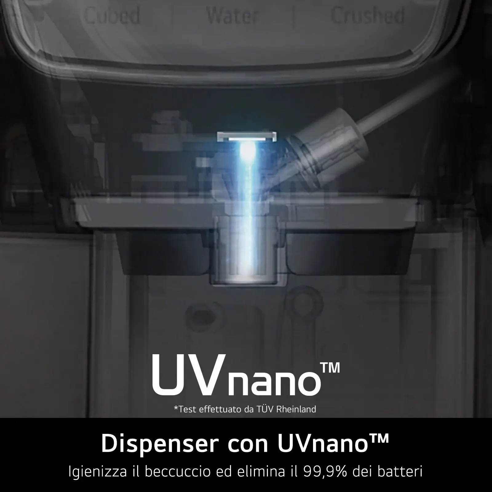 La tecnologia UVnano* igienizza il beccuccio del dispenser dell'acqua ogni ora, eliminando il 99,9% dei batteri* con l'azione dei raggi ultravioletti. In questo modo si evita la proliferazione dei batteri nei residui di acqua dopo l'erogazione.