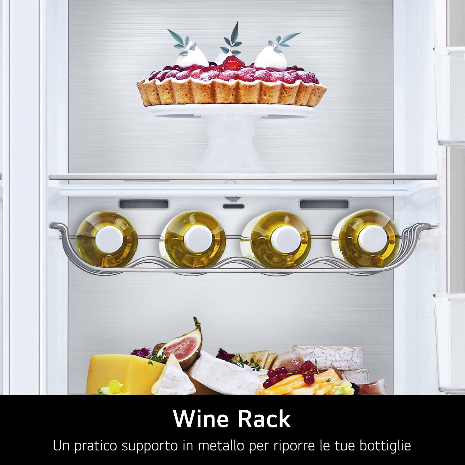 Se sei amante del vino e a casa tua non mancano mai delle bottiglie in fresco, il Wine Rack è un accessorio irrinunciabile. Si tratta di un supporto in metallo sagomato per organizzare e tenere in fresco fino a 4 bottiglie di vino, disposte parallelamente agli altri ripiani. Il supporto per le bottiglie è rimovibile qualora ti servisse più spazio all'interno del frigorifero.