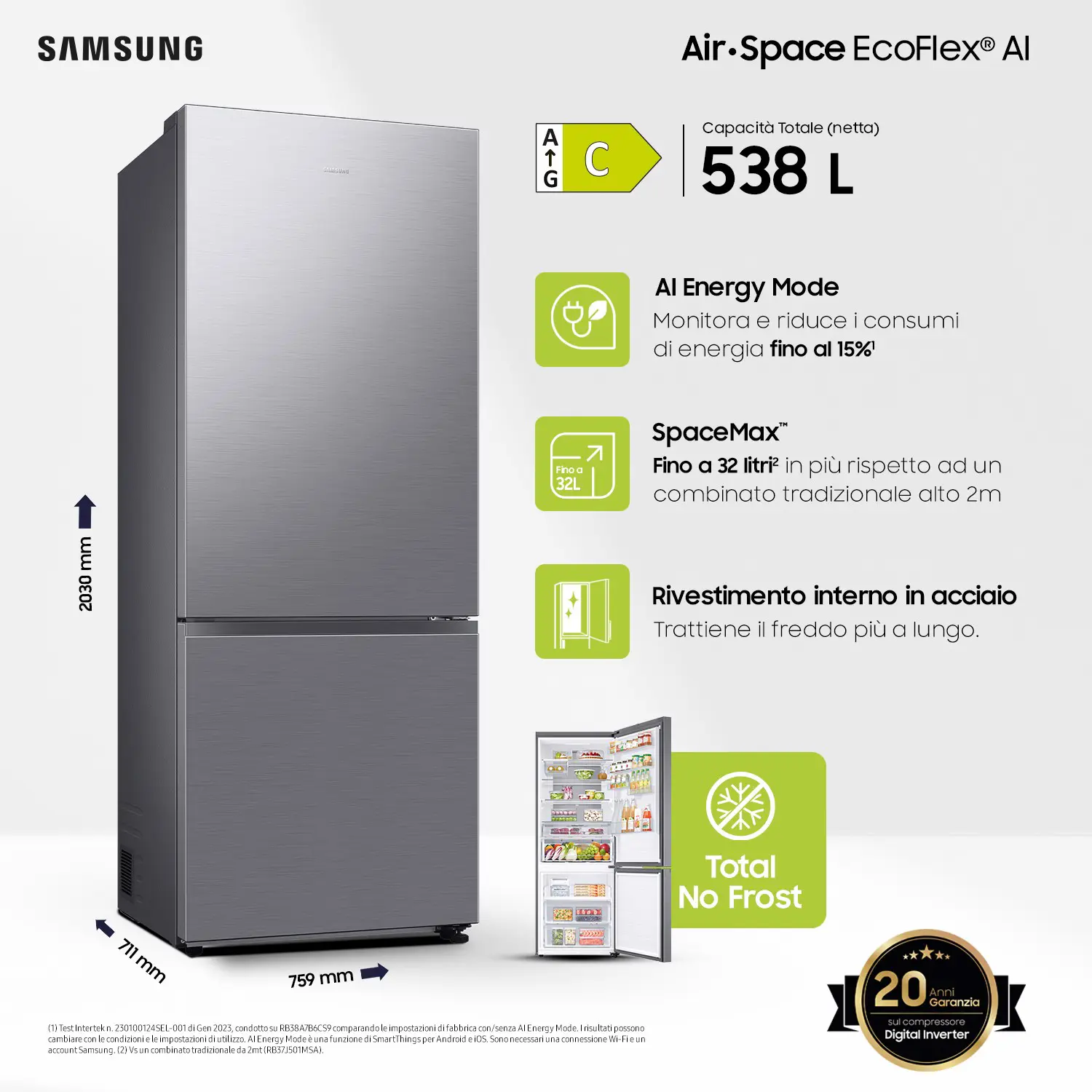 | Tecnologie Samsung (conservazione alimenti) | Raffreddamento completo, Digital Inverter Compressor, SpaceMax™ Technology, Total No Frost |