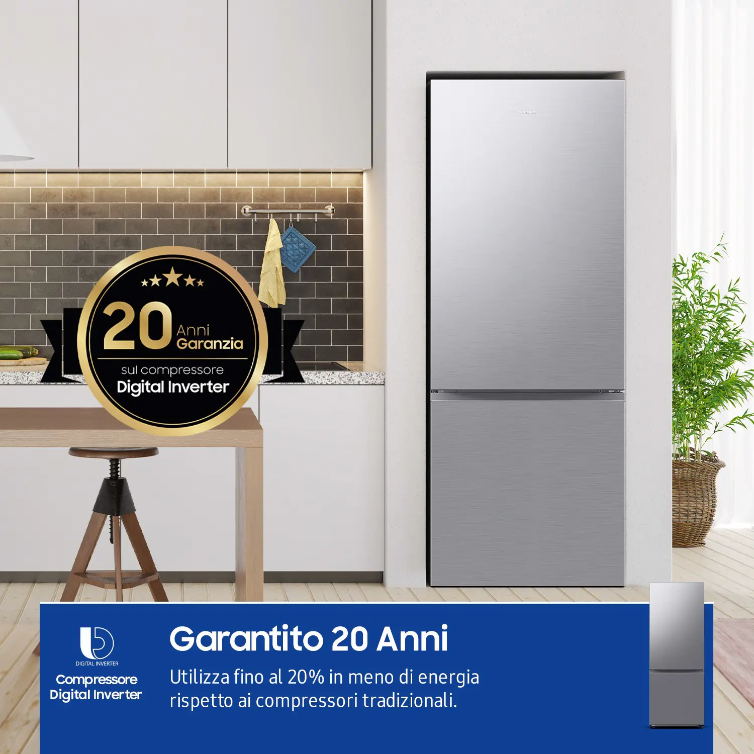 Conserva gli alimenti a una temperatura costante e risparmia energia. La struttura ottimizzata del compressore Digital Inverter ad alta efficienza si traduce in uninerzia 4,1 volte maggiore rispetto ai compressori attuali[8] e in un minor consumo di energia, in particolare nel mantenere una temperatura costante. In più, il compressore vanta una garanzia di 20 anni[9].