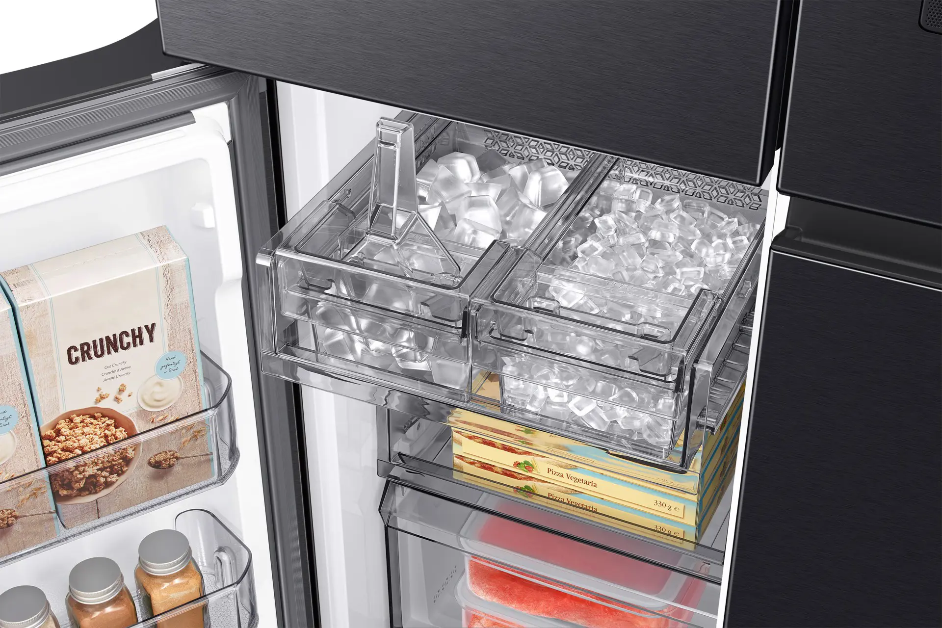 Due diversi tipi di ghiaccio, perfetti per ogni occasione. Il dispenser Dual Auto Ice Maker può produrre i classici cubetti di ghiaccio, ma anche gli Ice Bites™, per rinfrescare rapidamente le tue bevande. È in grado di produrre fino a 2,3 kg di ghiaccio al giorno e di conservarne fino a 4,1 kg[14]. Inoltre, posizionandolo allinterno del congelatore, eviterai di occupare spazio nel frigorifero.