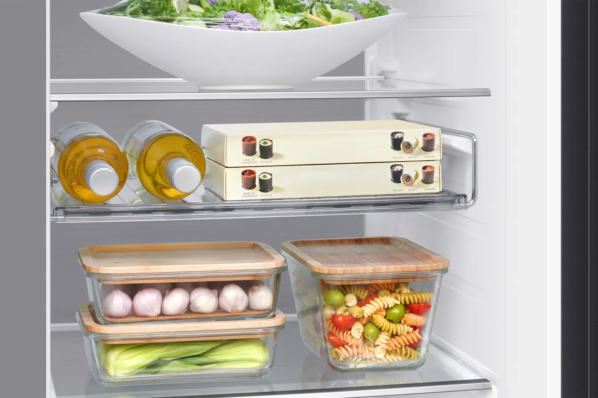 Un ripiano per vino multifunzionale che consente di sfruttare al meglio lo spazio del frigorifero. Grazie alla sua maggior larghezza può ospitare non solo bottiglie di vino di dimensioni standard ma anche più grandi, come quelle dello champagne. Una forma più piatta lo rende anche molto più versatile e adatto a contenere altri alimenti, come pizze e cartoni per le uova.