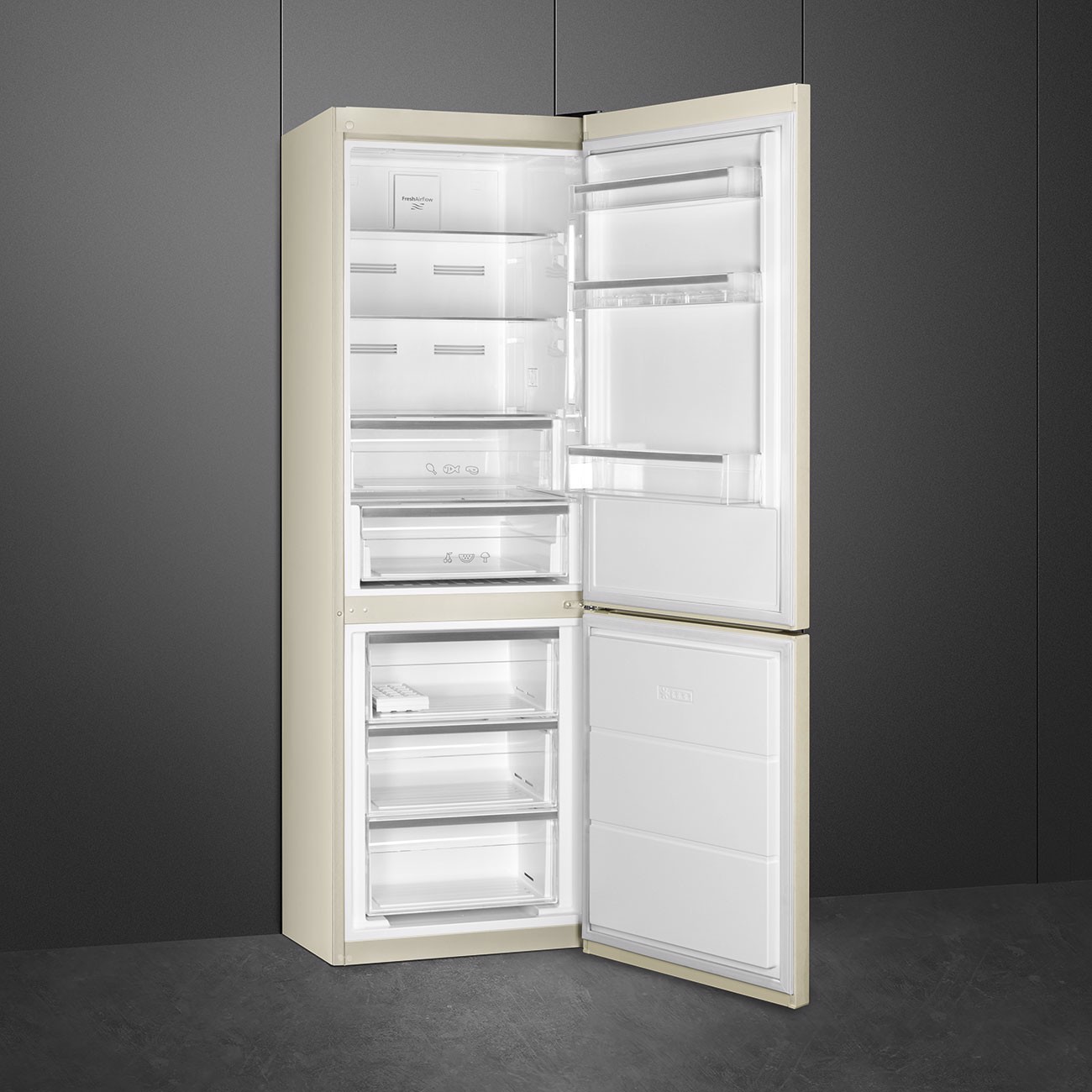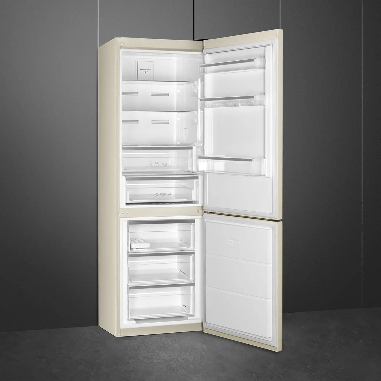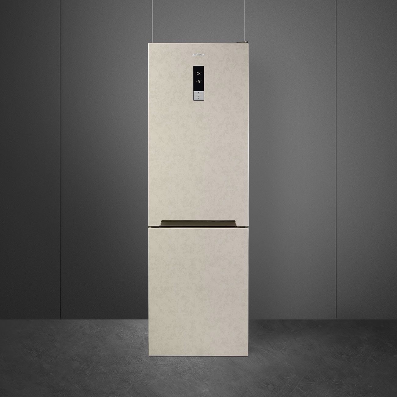 Smeg FC18EN4AM. Capacità netta totale: 324 L. Cerniera porta: Destra, Tipo di display: LCD. Classe climatica: SN-T, Emissione acustica: 41 dB. Capacità netta frigorifero: 230 L, No Frost (frigorifero), Sistema Multi-Airflow (frigorifero), Luce interna. Capacità netta congelatore: 94 L, Capacità di congelamento: 4 kg/24h, No Frost (congelatore). Compartimento zona fresca. Classe efficienza energetica: E, Consumo energetico annuo: 263 kWh