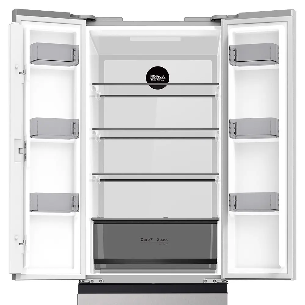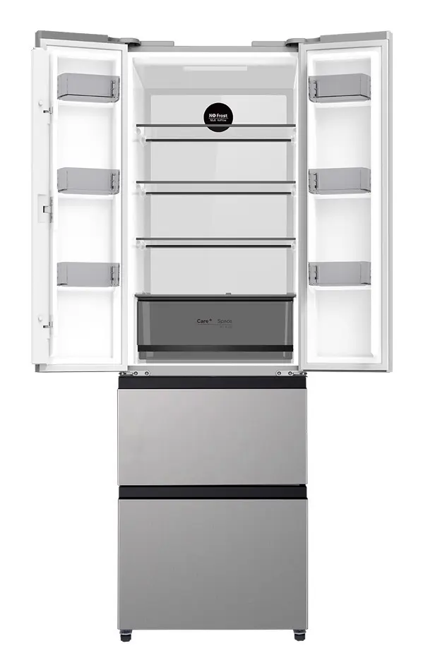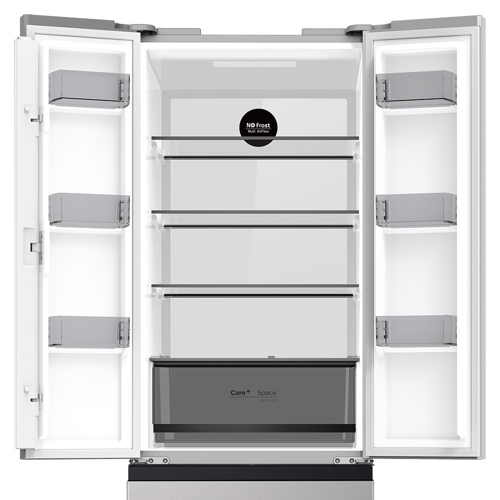 Parte posteriore interna del vano frigorifero rivestita in metallo. Questa caratteristica ha lo scopo di migliorare la conservazione degli alimenti, trattenendo il freddo e aiutando a mantenere una temperatura più stabile, anche quando la porta viene aperta frequentemente.