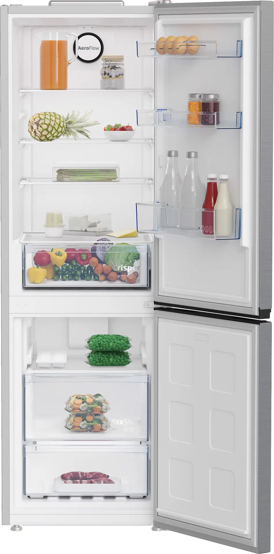 Beko B1RCNE364XB. Capacità netta totale: 316 L, Classe climatica: SN-T, Emissione acustica: 37 dB. Capacità netta frigorifero: 210 L, No Frost (frigorifero), Sistema Multi-Airflow (frigorifero), Luce interna, Numero di ripiani frigorifero: 4, Numero di cassetti per verdura: 1. Capacità netta congelatore: 106 L, Capacità di congelamento: 6 kg/24h, No Frost (congelatore). Classe efficienza energetica: E, Consumo energetico annuo: 247 kWh. Colore del prodotto: Acciaio inossidabile
