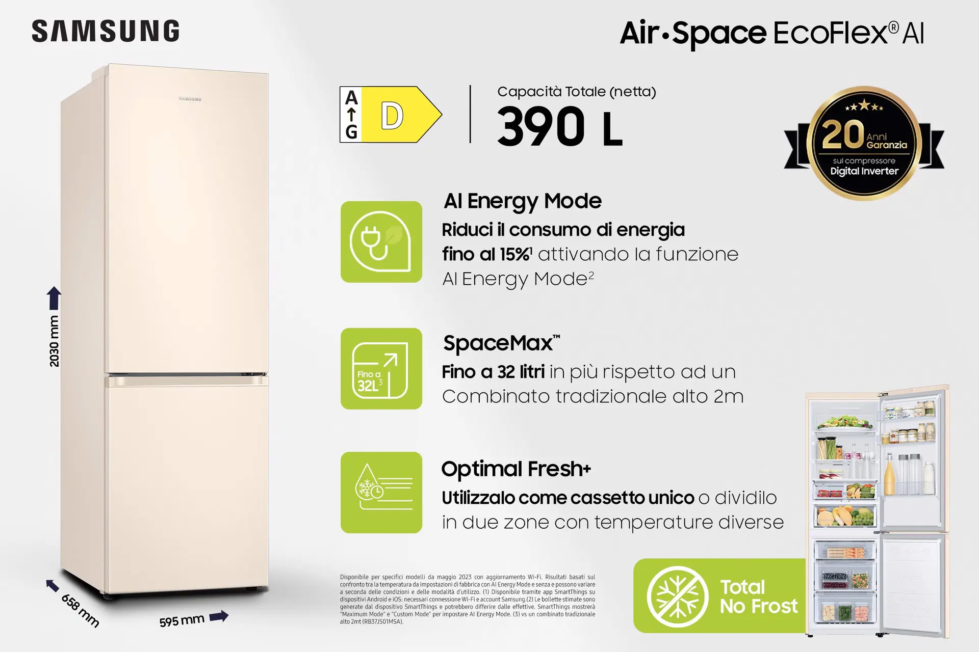 Questo frigorifero, grazie alla tecnologia SpaceMax, garantisce una capacità interna di 390 litri. L’isolante a elevata efficienza della tecnologia SpaceMax™ consente di ridurre notevolmente lo spessore delle pareti, creando più spazio per la conservazione degli alimenti, senza antiestetiche sporgenze esterne.