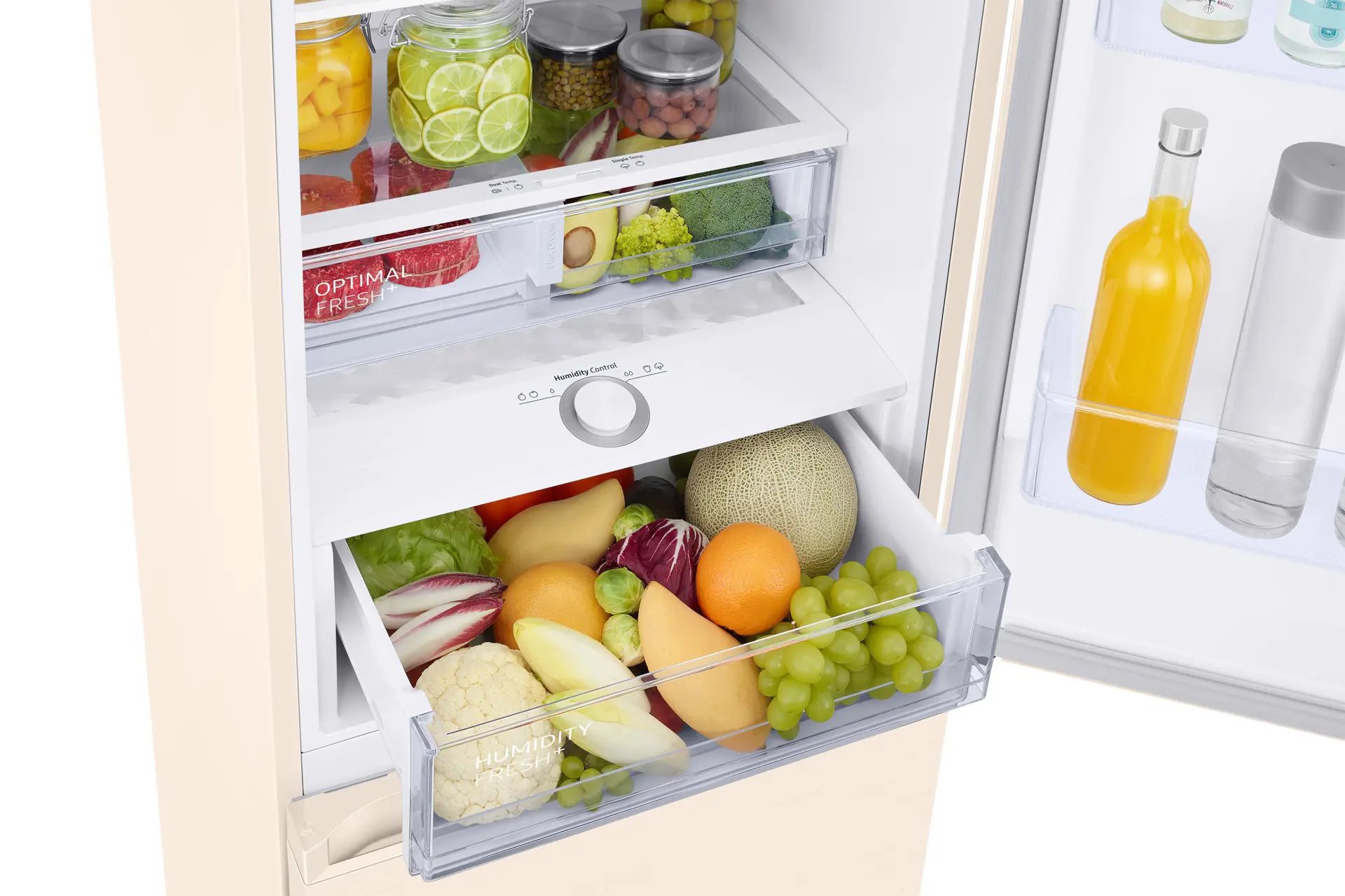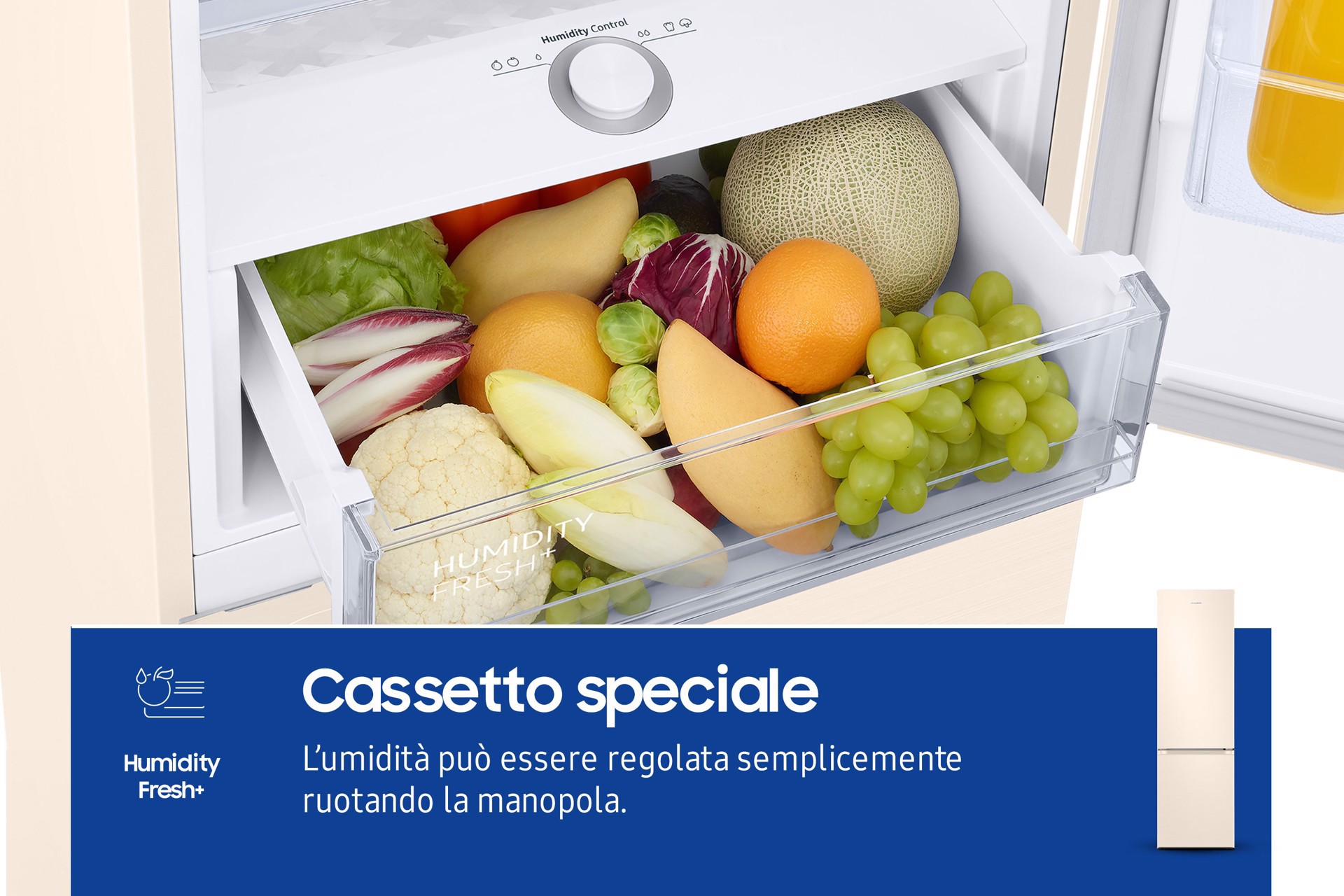 Preserva più a lungo la consistenza, il gusto e il sapore originali degli alimenti deperibili. Nel cassetto Humidity Fresh + l'umidità può essere regolata semplicemente ruotando la manopola. Crea l'ambiente ideale per conservare diversi tipi di frutta e verdura in modo che rimangano croccanti, freschi e succosi.