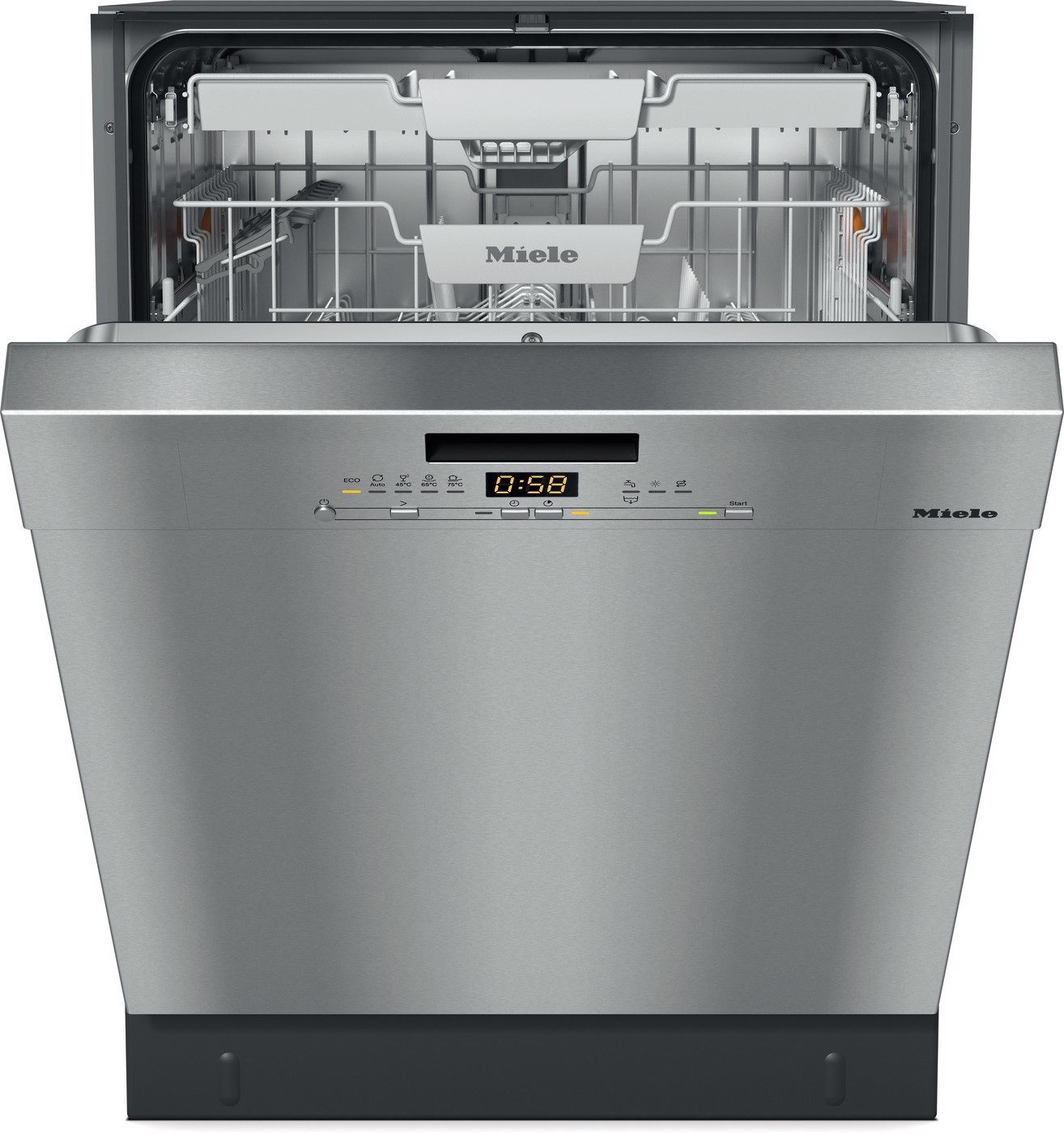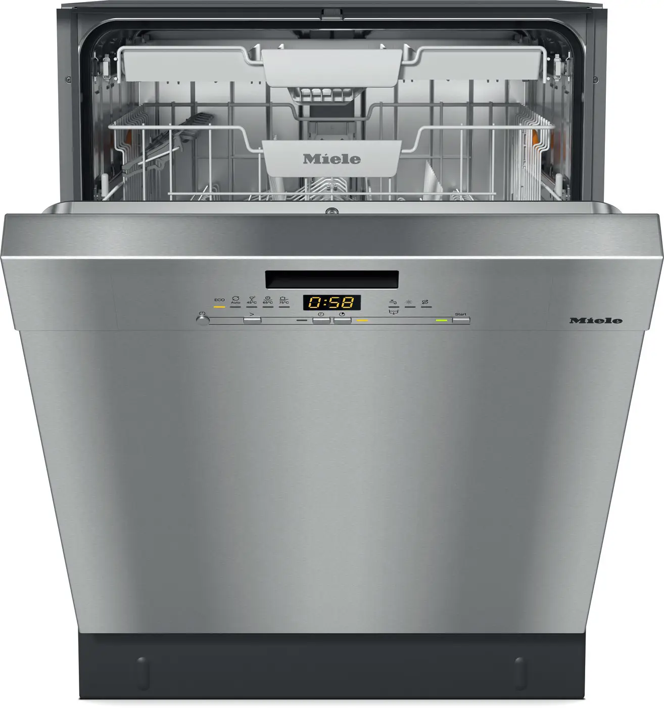Miele G 5611 SCU CLST. Posizionamento dell'apparecchio: Sottopiano, Dimensione: Dimensione massima (60 cm), Colore della porta: Acciaio inox. Numero di coperti: 14 coperti, Classe emissione rumore: C, Emissione acustica: 45 dB. Classe efficienza energetica: A, Consumo di acqua per ciclo: 8,2 L, Consumo energetico per 100 cicli: 54 kWh. Larghezza: 598 mm, Profondità: 570 mm, Altezza: 805 mm. Tecnologie Miele (lavaggio stoviglie): AutoOpen drying, BrilliantGlassCare, EcoPower, QuickPowerWash