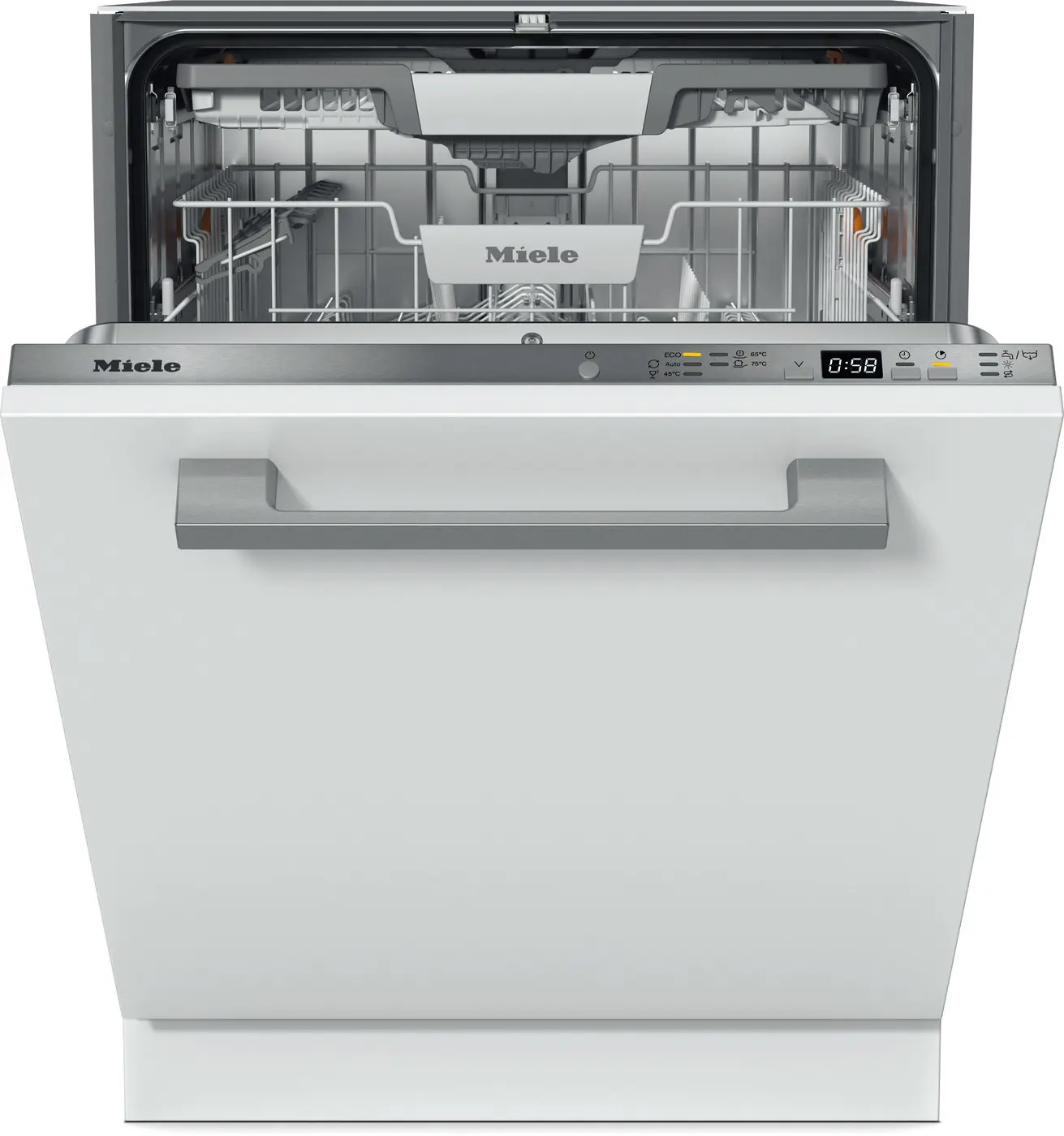 Miele G 5853 SCVI. Posizionamento dell'apparecchio: A scomparsa totale, Dimensione: Dimensione massima (60 cm), Colore pannello di controllo: Acciaio inox. Numero di coperti: 14 coperti, Classe emissione rumore: B, Emissione acustica: 43 dB. Classe efficienza energetica: A, Consumo di acqua per ciclo: 8,2 L, Consumo energetico per 100 cicli: 54 kWh. Larghezza: 598 mm, Profondità: 550 mm, Altezza: 805 mm. Tecnologie Miele (lavaggio stoviglie): AutoOpen drying, BrilliantGlassCare, EcoPower, QuickPowerWash