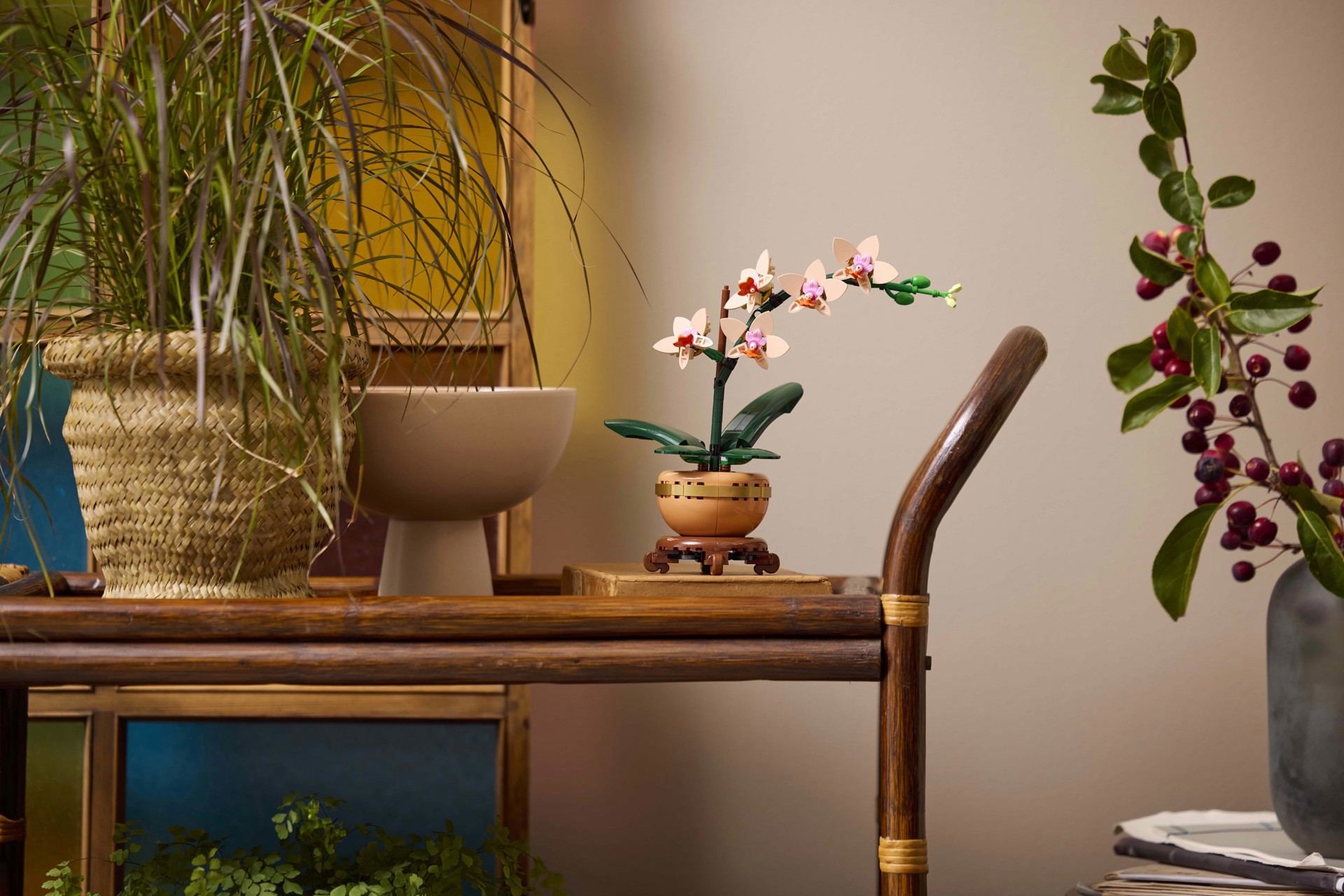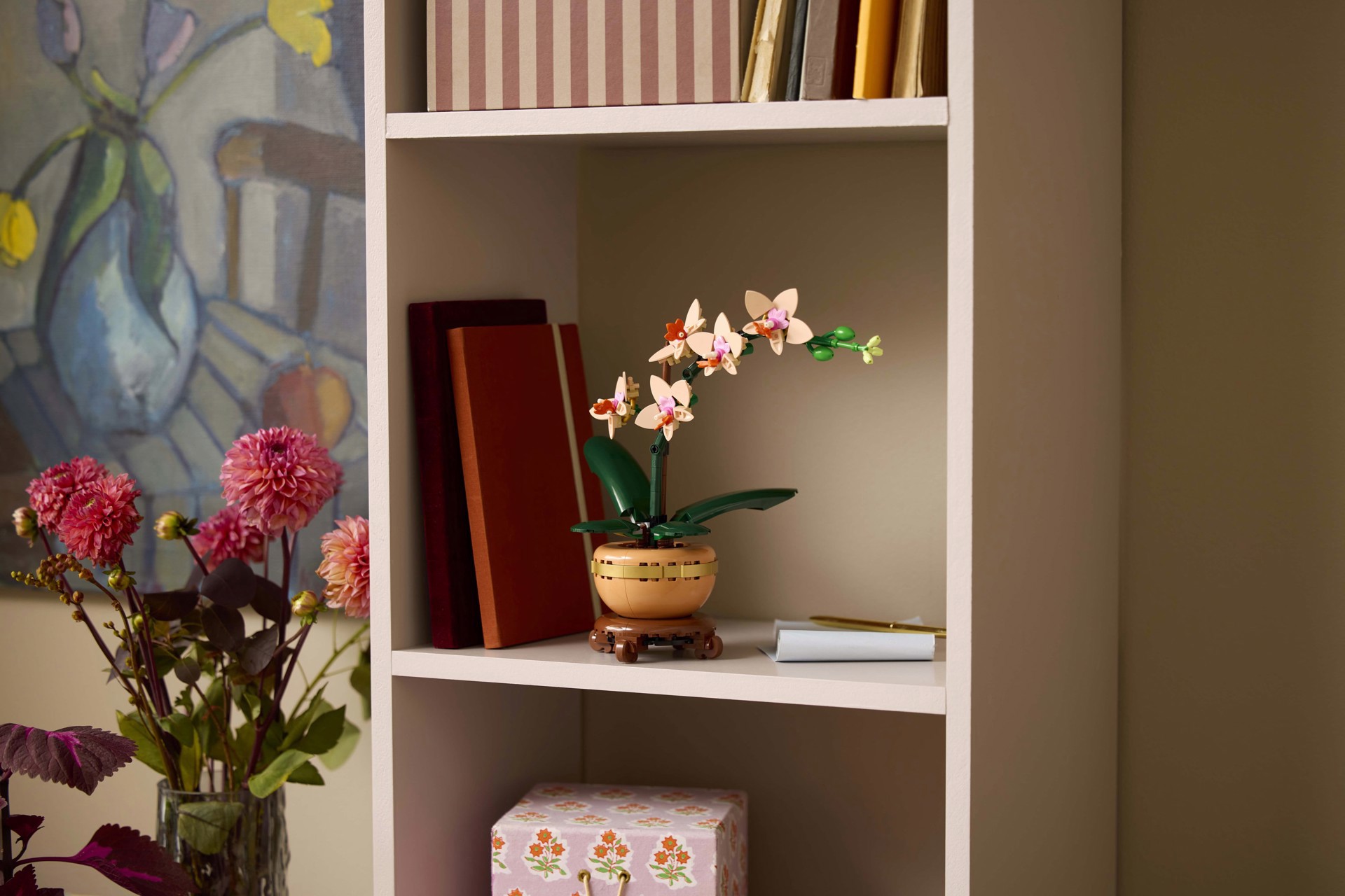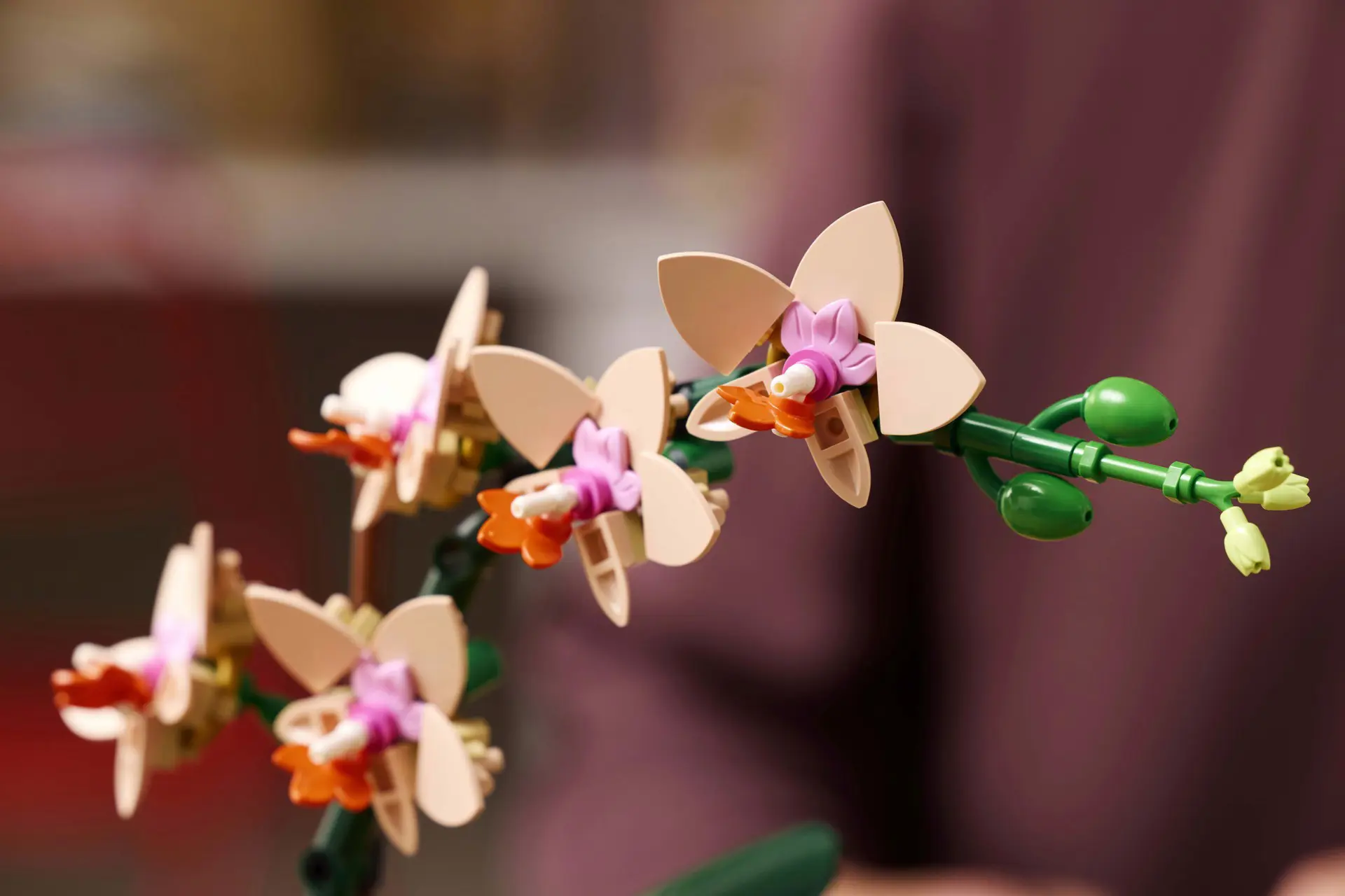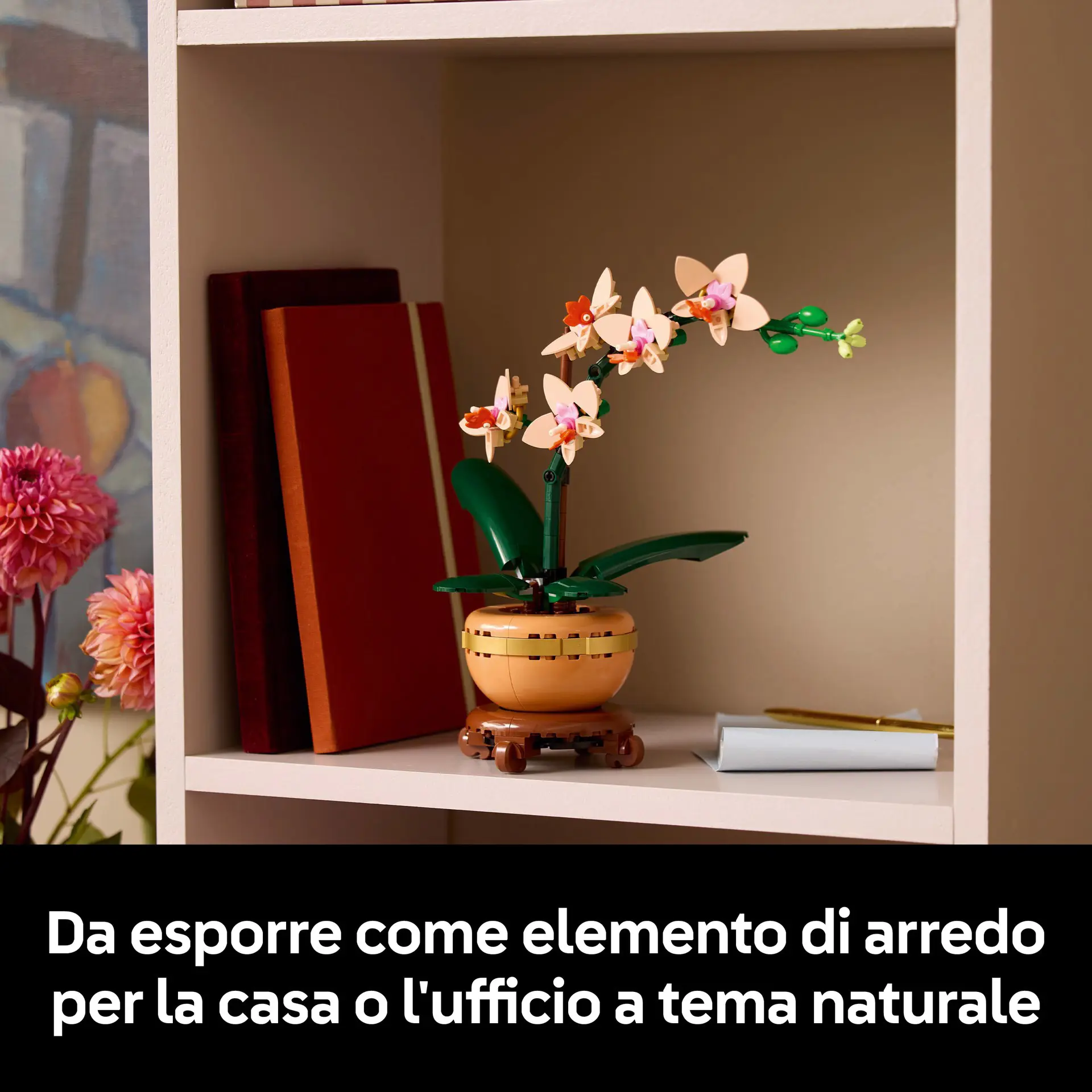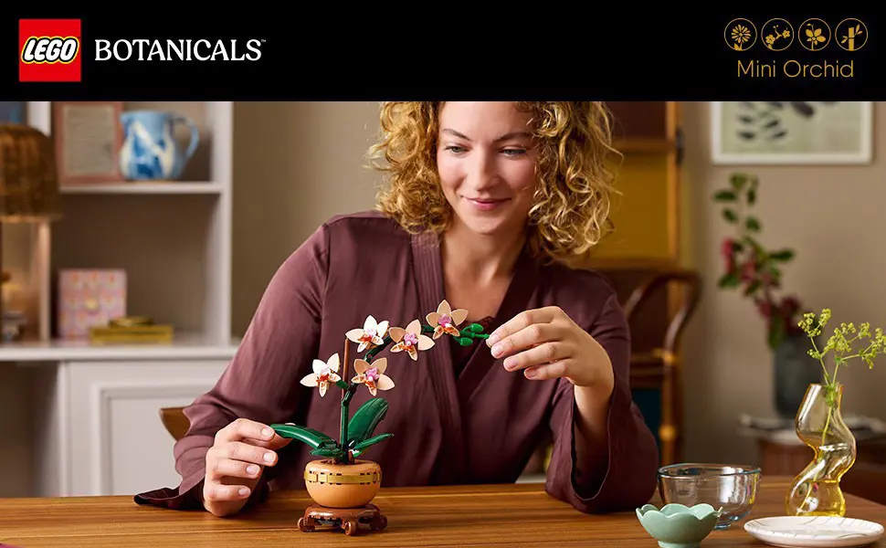 La replica realistica presenta 5 fiori di orchidea in fiore e alcuni in bocciolo, oltre a foglie per tanta autenticità in più. Contiene inoltre un vaso da fiori color pesca posizionato su uno splendido piedistallo effetto legno, facilitando l’esposizione del fiore LEGO da parte dei fioristi in erba che potranno così portare tanta tranquillità naturale in qualsiasi spazio di vita o di lavoro.