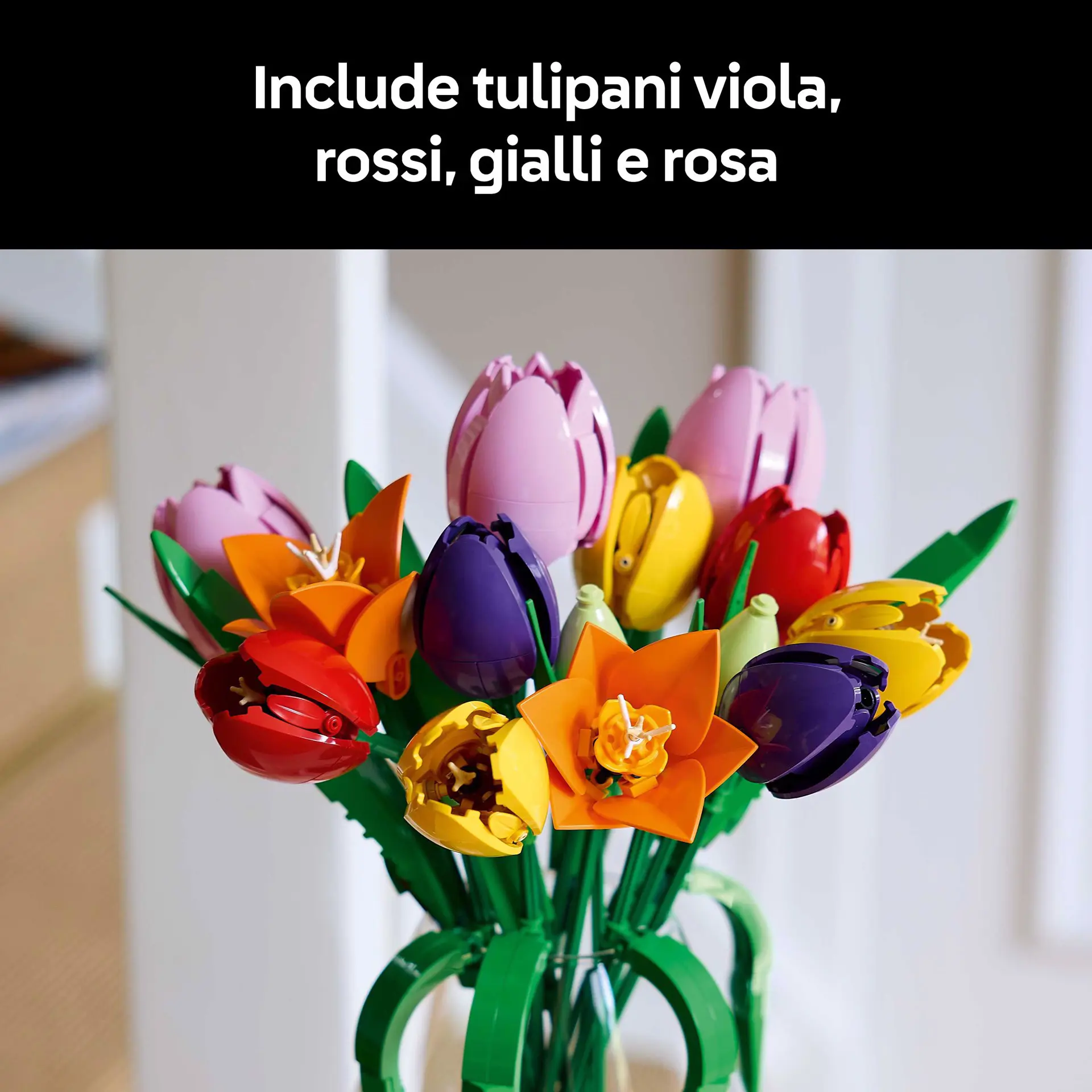 5 TULIPANI LEGO®: il bouquet include 5 varietà di tulipani in vari colori e fasi di fioritura; ci sono boccioli verdi, tulipani viola chiusi e tulipani rossi, gialli, rosa e arancioni aperti