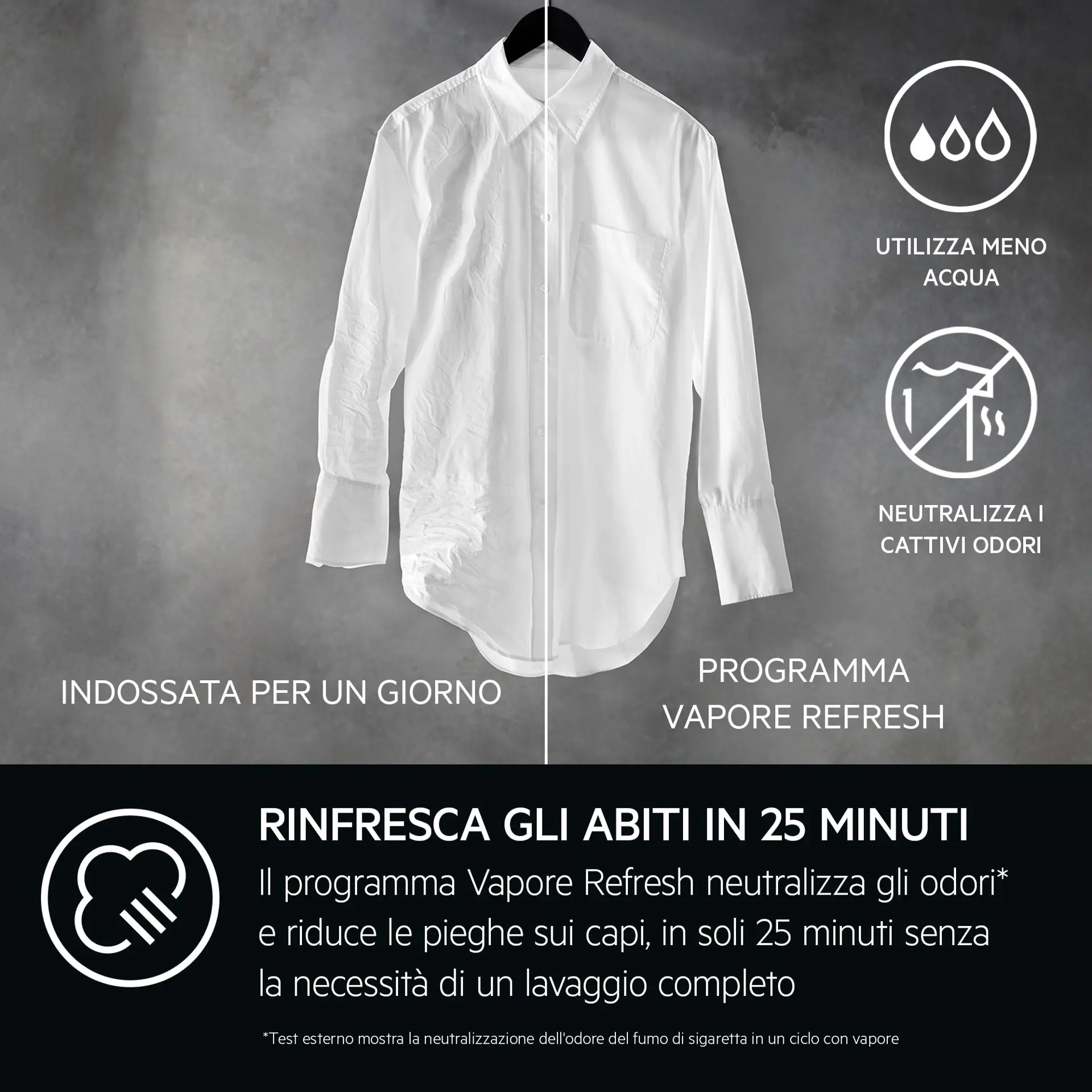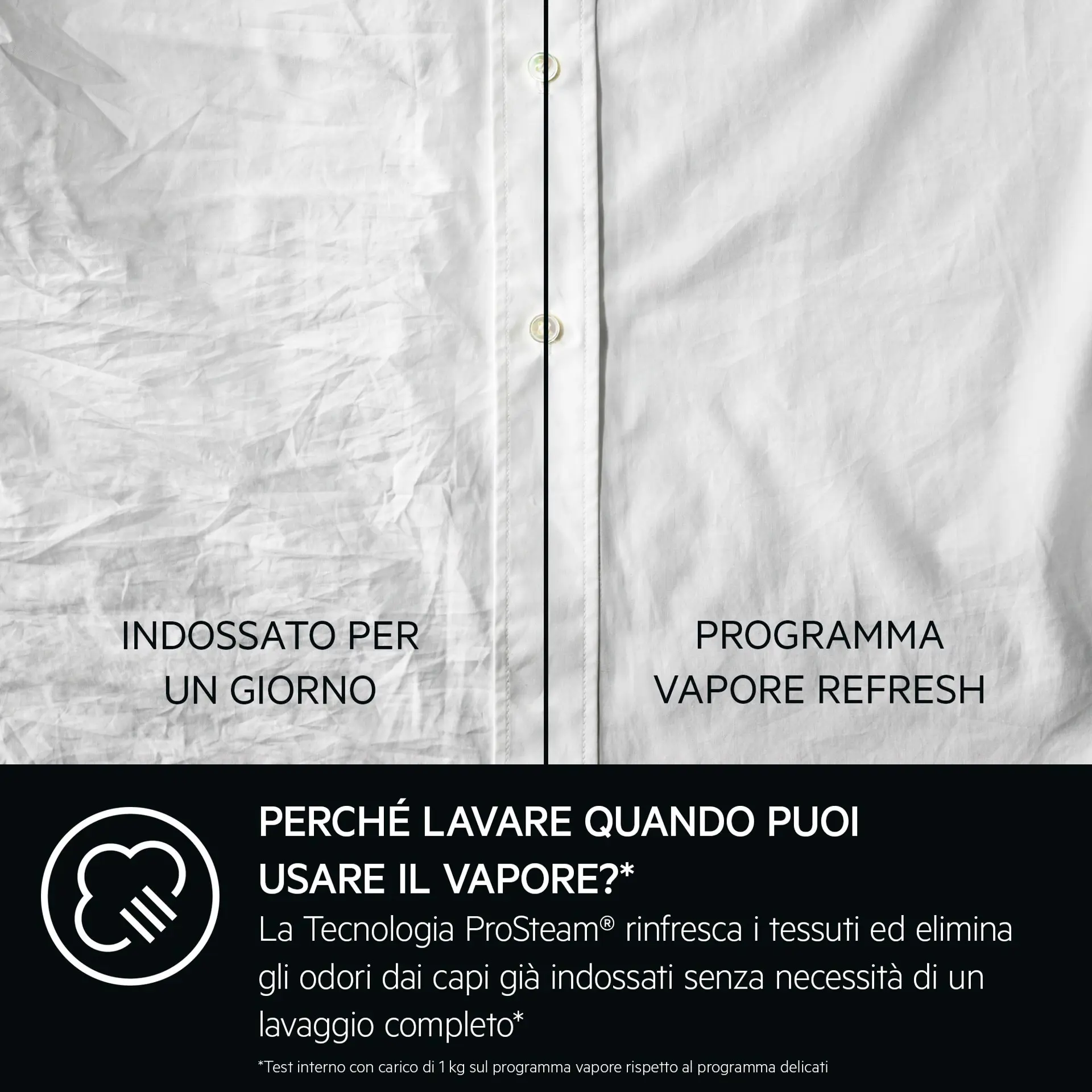 Il vapore rinfresca rapidamente i tessuti ed elimina gli odori dai capi già indossati, consumando solo 2L d’acqua per ciclo. Aggiungendo invece l’opzione Vapore Finale al termine di un ciclo di lavaggio, puoi ridurre le pieghe e il tempo di stiratura.