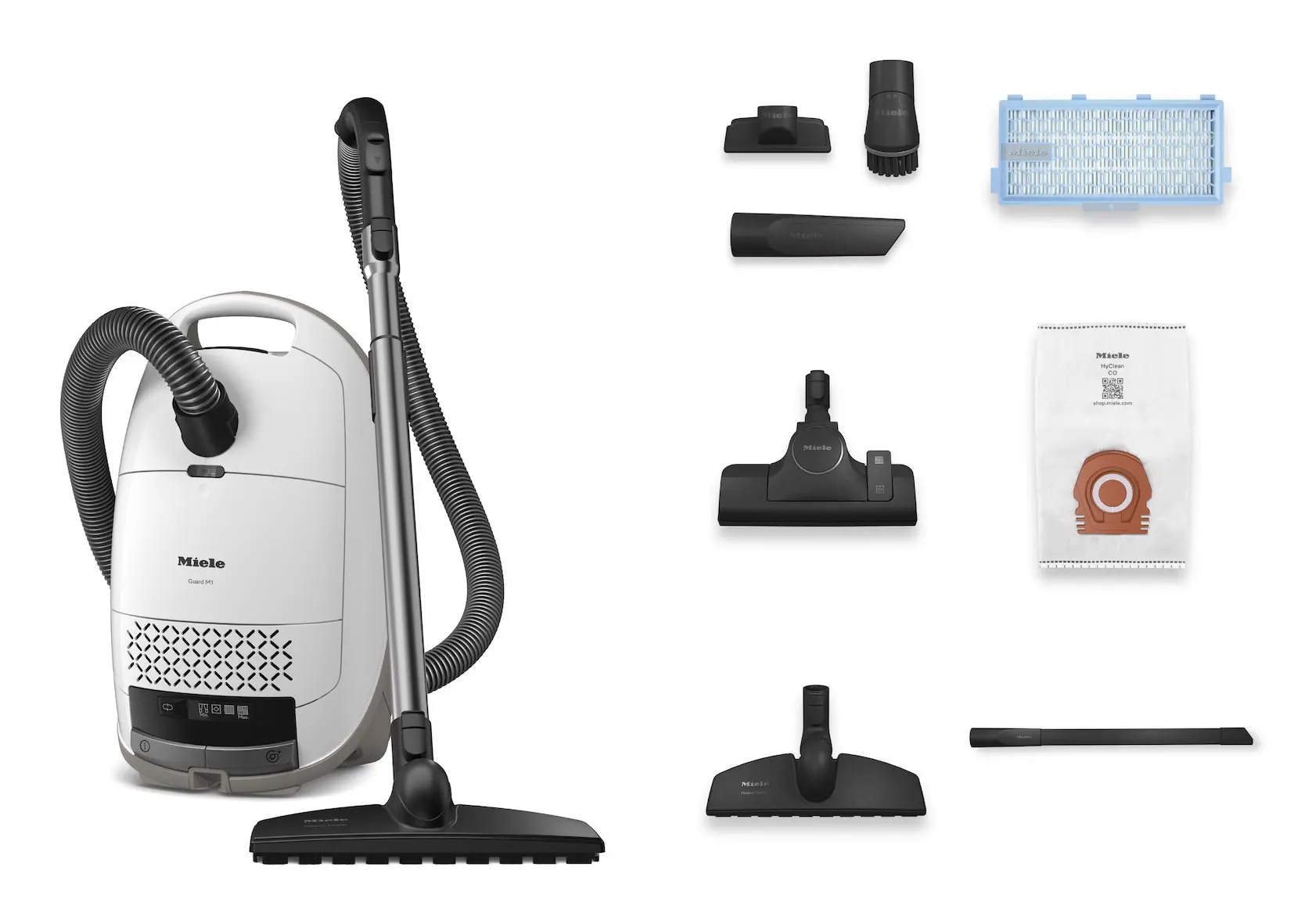 Miele Guard M1 Parquet Flex. Massima potenza in entrata: 890 W. Tipo: A cilindro, Tipo di pulizia: Secco, Tipo di contenitore della polvere: Sacchetto per la polvere, Capacità del contenitore: 4,5 L. Sistema di filtraggio dell'aspirapolvere: Miele AirClean Plus, Metodo di separazione dello sporco: Filtro, Emissione acustica: 77 dB. Colore del prodotto: Bianco