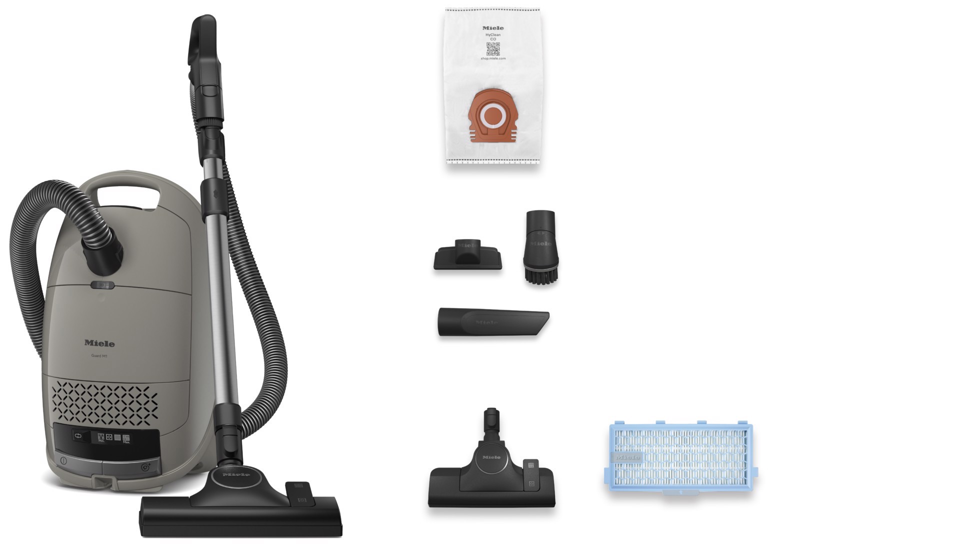 Miele Guard M1 Select. Massima potenza in entrata: 890 W. Tipo: A cilindro, Tipo di pulizia: Secco, Tipo di contenitore della polvere: Sacchetto per la polvere, Capacità del contenitore: 4,5 L. Sistema di filtraggio dell'aspirapolvere: Filtro AirClean Miele, Metodo di separazione dello sporco: Filtro, Emissione acustica: 77 dB. Colore del prodotto: Grigio