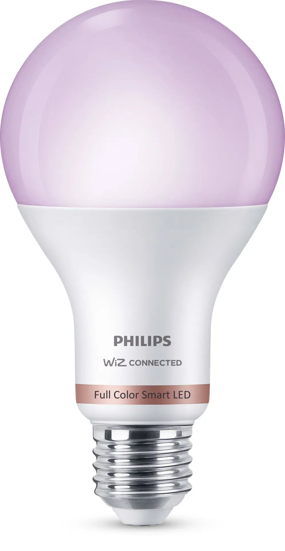 Philips Lampadina 13 W (Eq.100 W) A67 E27. Tipo: Lampadina intelligente, Colore del prodotto: Bianco, Attacco lampada: E27. Classe efficienza energetica: E, Consumo di energia per 1.000 ore: 13 kWh, Tensione di ingresso AC: 220-240 V. Larghezza: 77 mm, Profondità: 142 mm, Altezza: 142 mm. Larghezza imballo: 85 mm, Profondità imballo: 85 mm, Altezza imballo: 185 mm. Quantità per pacco: 1 pz