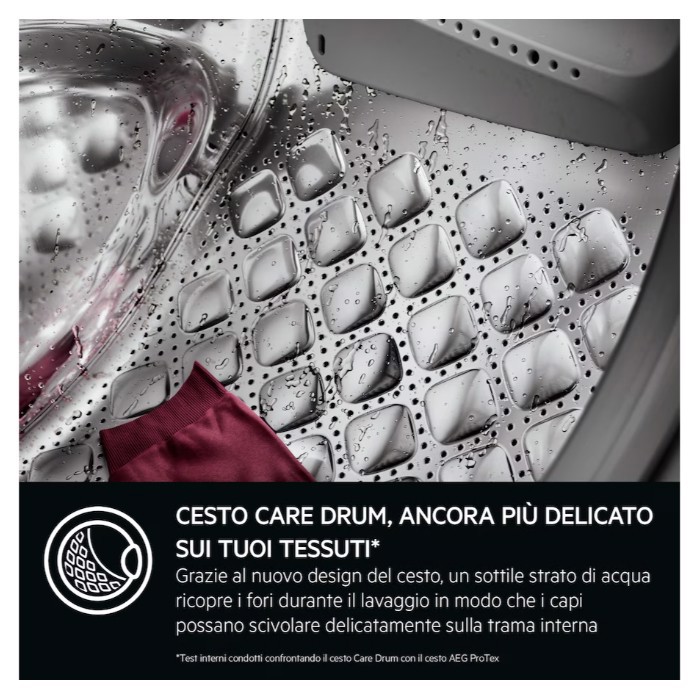 Il cesto CareDrum XL combina il massimo spazio per grandi carichi, le nostre migliori prestazioni in programmi brevi e l'eccezionale efficienza energetica. Il design unico simile a dei cuscinetti rialzati consente ai capi di scivolare delicatamente sulla trama interna riducendo l'usura dei vestiti.