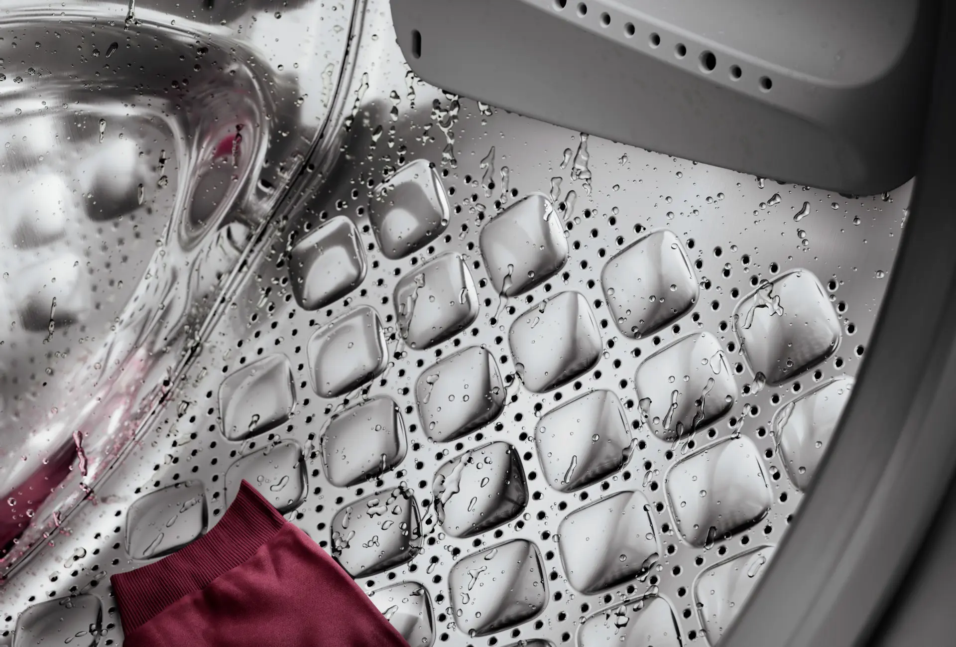Grazie al nuovo design del cesto, un sottile strato di acqua ricopre i fori durante il lavaggio in modo che i capi possano scivolare delicatamente sulla trama interna. Così si riduce lo sfregamento dei tessuti, per capi che durano più a lungo nel tempo.