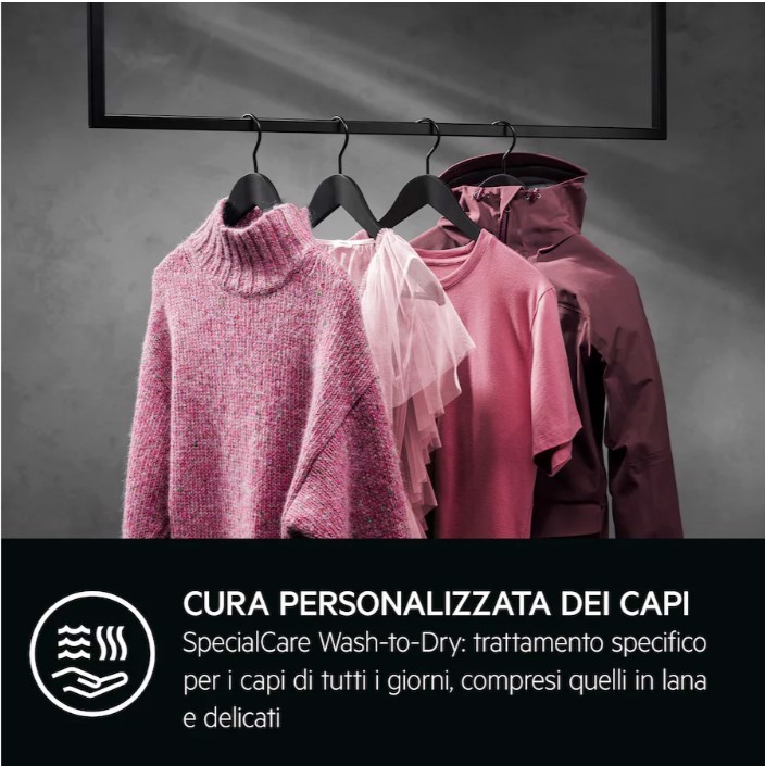 Il ciclo completo SpecialCare si adatta a ogni tipo di tessuto, per una pulizia delicata ma efficace. Questo apparecchio, con certificazione Woolmark Blue, lava e asciuga capi di uso quotidiano, delicati e lana. Ripristina la protezione dall’acqua per capi per uso all'aperto.
