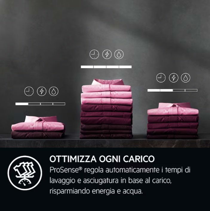 | Tecnologie AEG (cura dei vestiti) | AbsoluteCare®, PreciseLoad, Tecnologia ProSense, SensiDry, SpecialCare Wash-to-Dry |