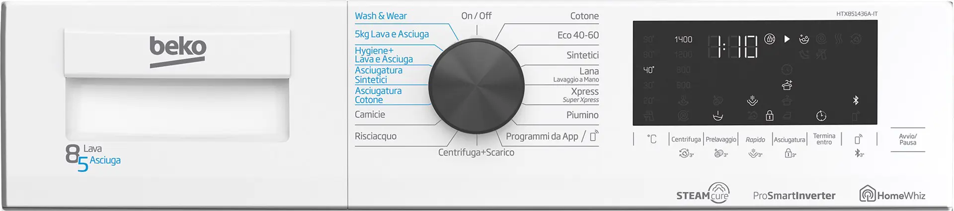 | Programmi di lavaggio | Cotone, Delicati/Seta, Eco, A mano/Lana, Prelavaggio, Rapido, Risciacquo, Centrifuga/scarico |