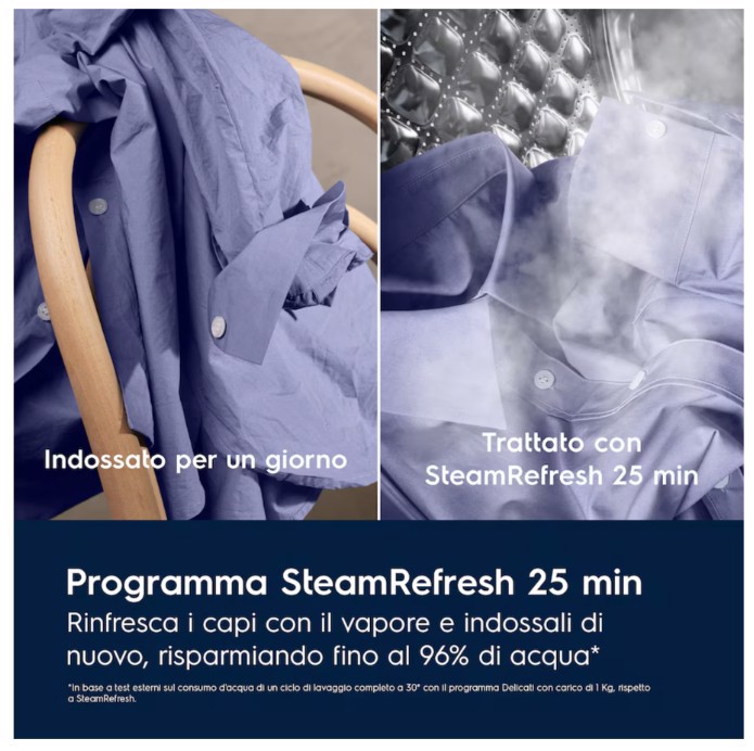Il programma Vapore Refresh 25 min è adatto per capi delicati e utilizza meno acqua rispetto al normale lavaggio. Per una sensazione ancora più fresca, è possibile aggiungere Electrolux Steam Fragrance.