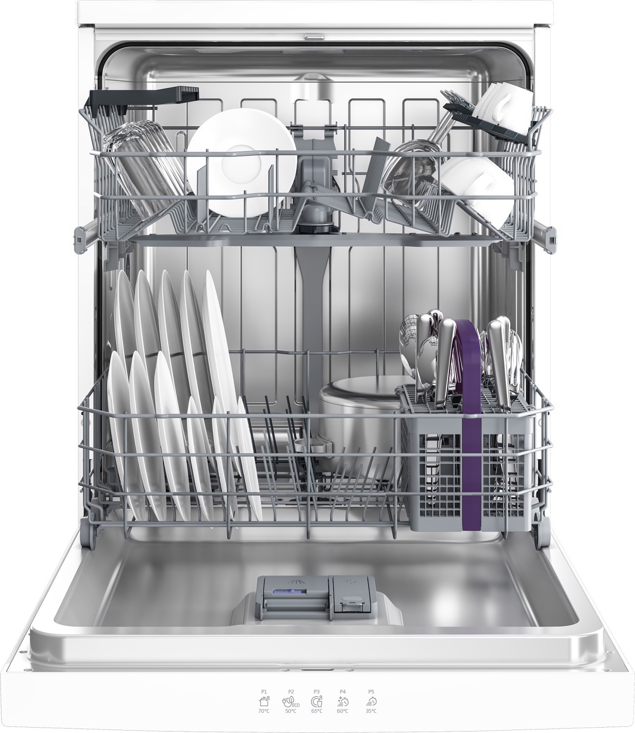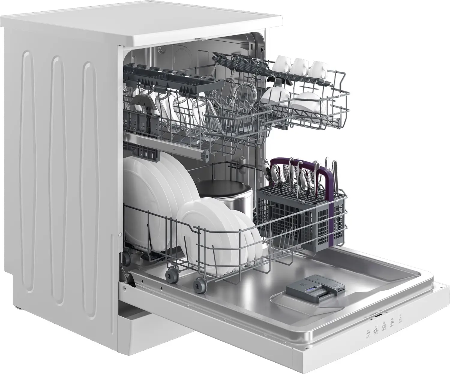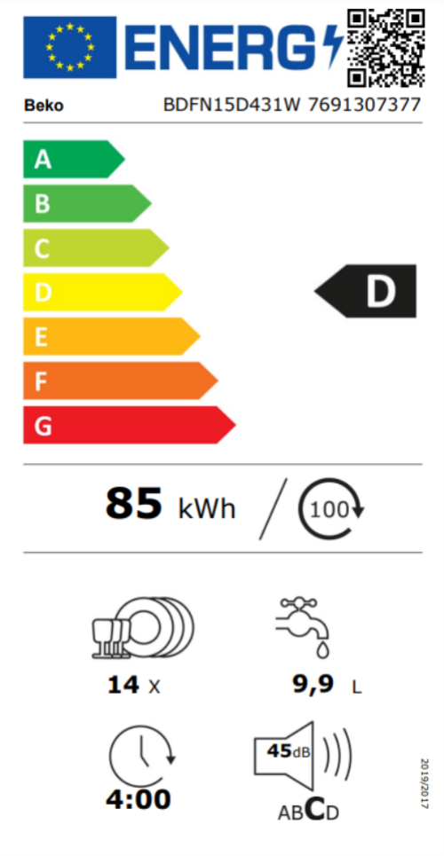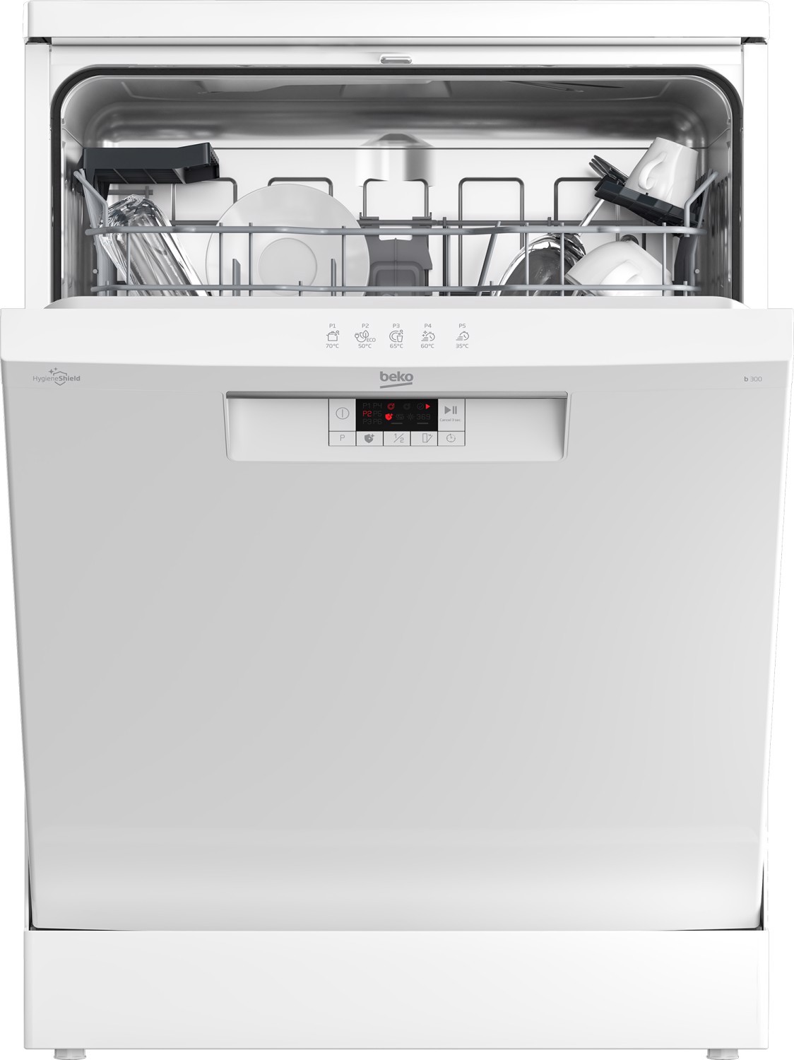 Beko b300 BDFN15D431W. Posizionamento dell'apparecchio: Libera installazione, Dimensione: Dimensione massima (60 cm), Colore della porta: Bianco. Numero di coperti: 14 coperti, Classe emissione rumore: C, Emissione acustica: 45 dB. Classe efficienza energetica: D, Consumo di acqua per ciclo: 9,9 L, Consumo energetico per 100 cicli: 85 kWh. Larghezza: 598 mm, Profondità: 600 mm, Altezza: 850 mm. Larghezza imballo: 644 mm, Profondità imballo: 661 mm, Altezza imballo: 889 mm