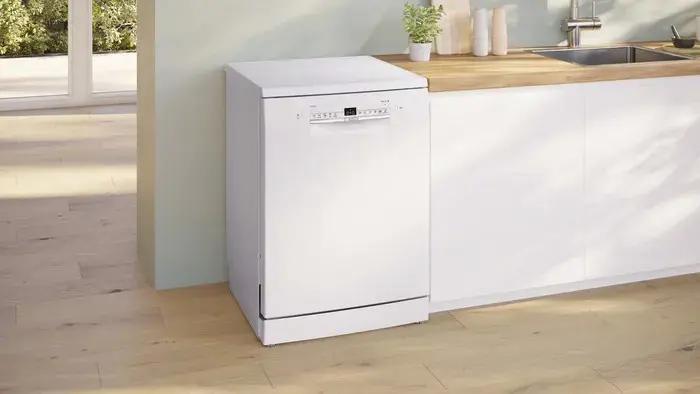 Bosch Serie 2 SMS2HTW06E. Posizionamento dell'apparecchio: Libera installazione, Dimensione: Dimensione massima (60 cm), Colore della porta: Bianco. Numero di coperti: 13 coperti, Classe emissione rumore: C, Emissione acustica: 46 dB. Regolazione piedini: 2 cm, Applicazioni per il controllo supportate: Home Connect. Classe efficienza energetica: C, Consumo di acqua per ciclo: 9 L, Consumo energetico per 100 cicli: 74 kWh. Larghezza: 600 mm, Profondità: 600 mm, Altezza: 845 mm