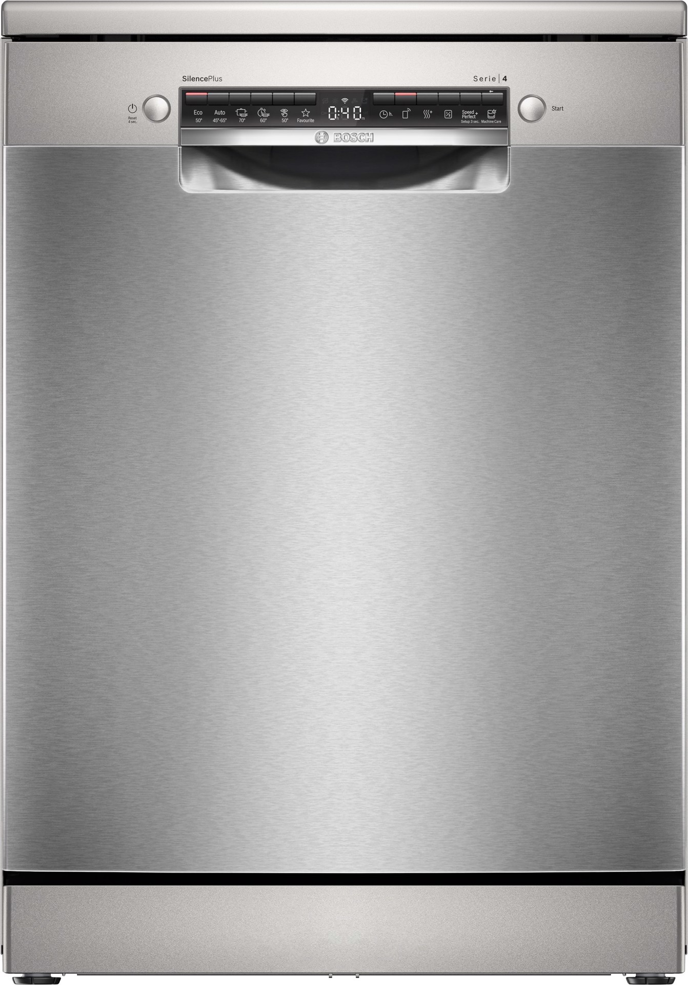 Bosch Serie 4 SMS4ECI27E Lavastoviglie da libera installazione 60 cm Acciaio Classe A. Posizionamento dell'apparecchio: Libera installazione, Dimensione: Dimensione massima (60 cm), Colore della porta: Acciaio inox. Numero di coperti: 14 coperti, Classe emissione rumore: B, Emissione acustica: 42 dB. Regolazione piedini: 2 cm, Applicazioni per il controllo supportate: Bosch Home Connect. Classe efficienza energetica: A, Consumo di acqua per ciclo: 9 L, Consumo energetico per 100 cicli: 54 kWh. Larghezza: 600 mm, Profondità: 600 mm, Altezza: 845 mm