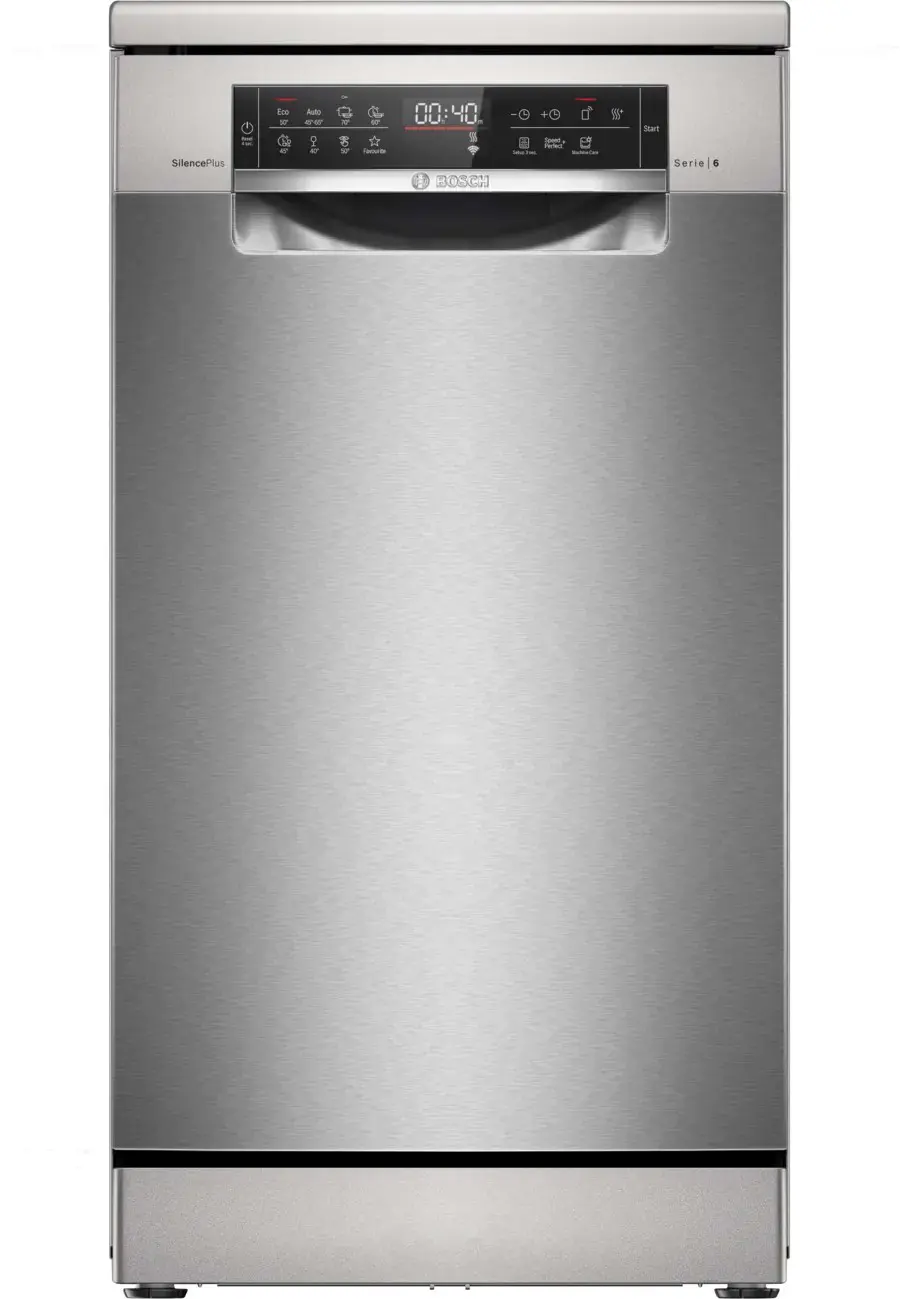Bosch Serie 6 SPS6EMI21E. Posizionamento dell'apparecchio: Libera installazione, Dimensione: Compatta (45 cm), Colore della porta: Acciaio spazzolato. Numero di coperti: 10 coperti, Classe emissione rumore: B, Emissione acustica: 44 dB. Regolazione piedini: 2 cm, Applicazioni per il controllo supportate: Home Connect, Funzioni delle app: Remote diagnostics, Monitoraggio remoto. Classe efficienza energetica: B, Consumo di acqua per ciclo: 8,7 L, Consumo energetico per 100 cicli: 51 kWh. Larghezza: 450 mm, Profondità: 600 mm, Altezza: 845 mm