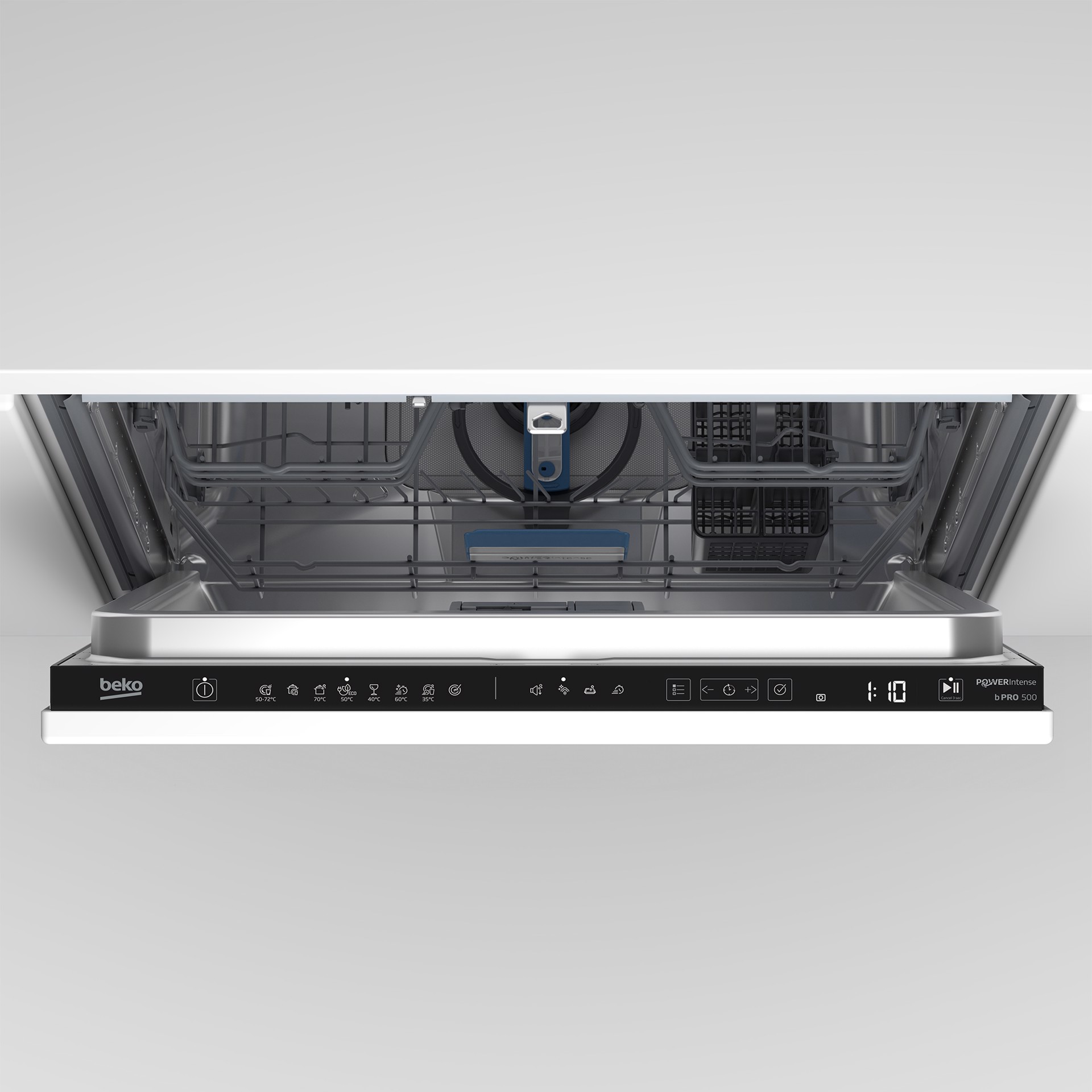 Beko b300 BDIN38561P: Lavastoviglie a Scomparsa Totale Classe A, 60 cm, 15 Coperti. Posizionamento dell'apparecchio: A scomparsa totale, Dimensione: Dimensione massima (60 cm), Colore pannello di controllo: Nero. Numero di coperti: 15 coperti, Classe emissione rumore: B, Emissione acustica: 41 dB. Classe efficienza energetica: A, Consumo di acqua per ciclo: 8,9 L, Consumo energetico per 100 cicli: 55 kWh. Larghezza: 598 mm, Profondità: 550 mm, Altezza: 818 mm. Tecnologie Beko (lavaggio stoviglie): Fast+, SilentWash, TrayWash™ System, SelfDry, SteamGloss®, SensorAdapt, AquaFlex®, Flexible 3rd Rack