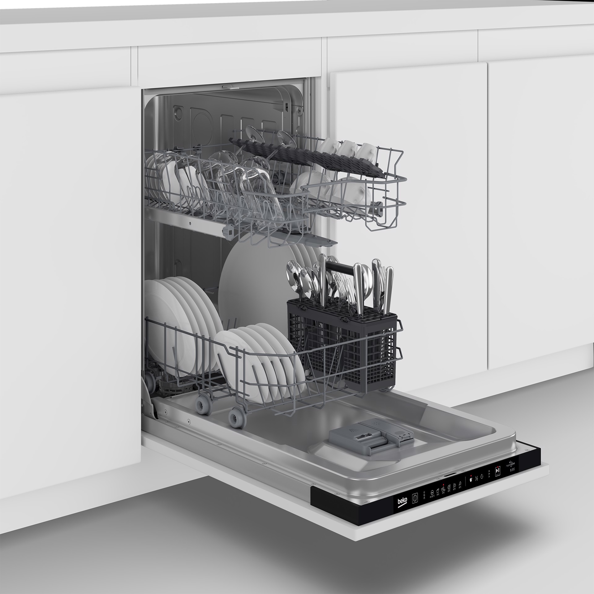 | Tecnologie Beko (lavaggio stoviglie) | Adjustable Plate Spikes (Lower Basket), Auto programmes, Cestello per posate, Fully Flexible Upper Basket, HygieneIntense, Mini 30' |