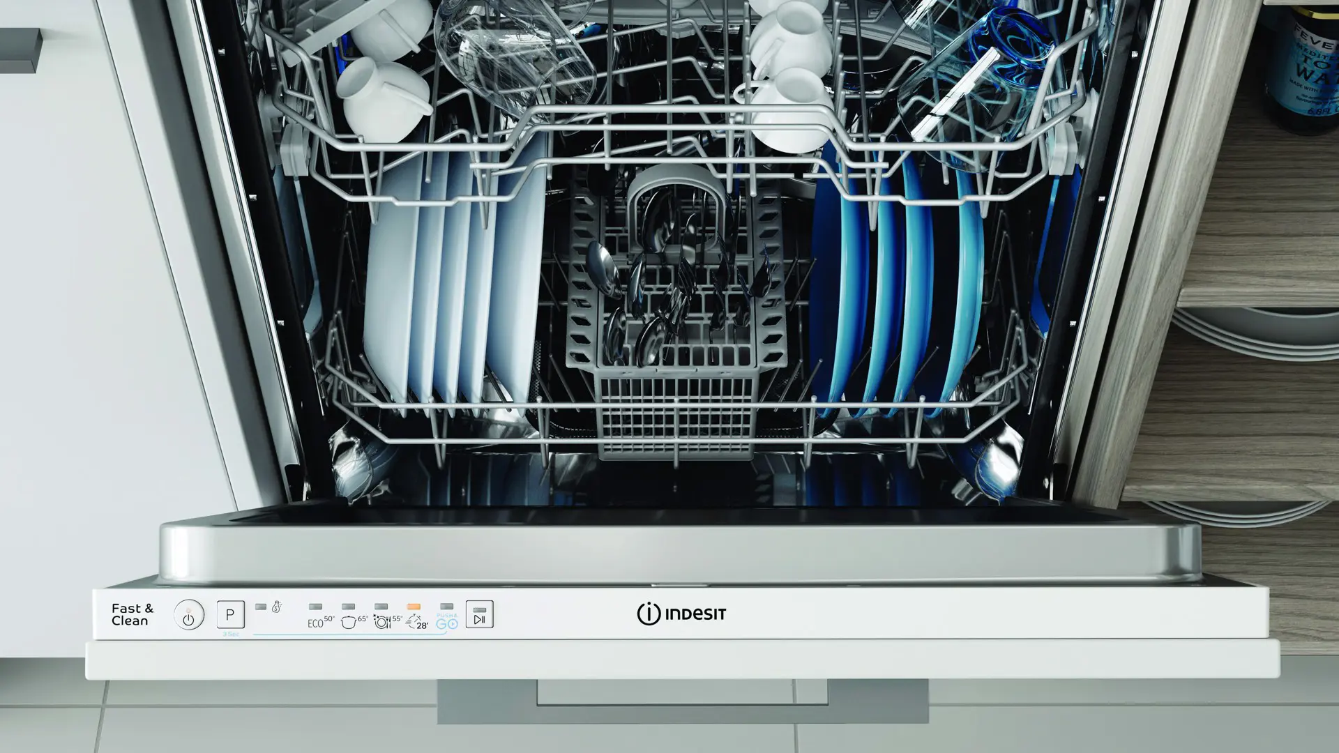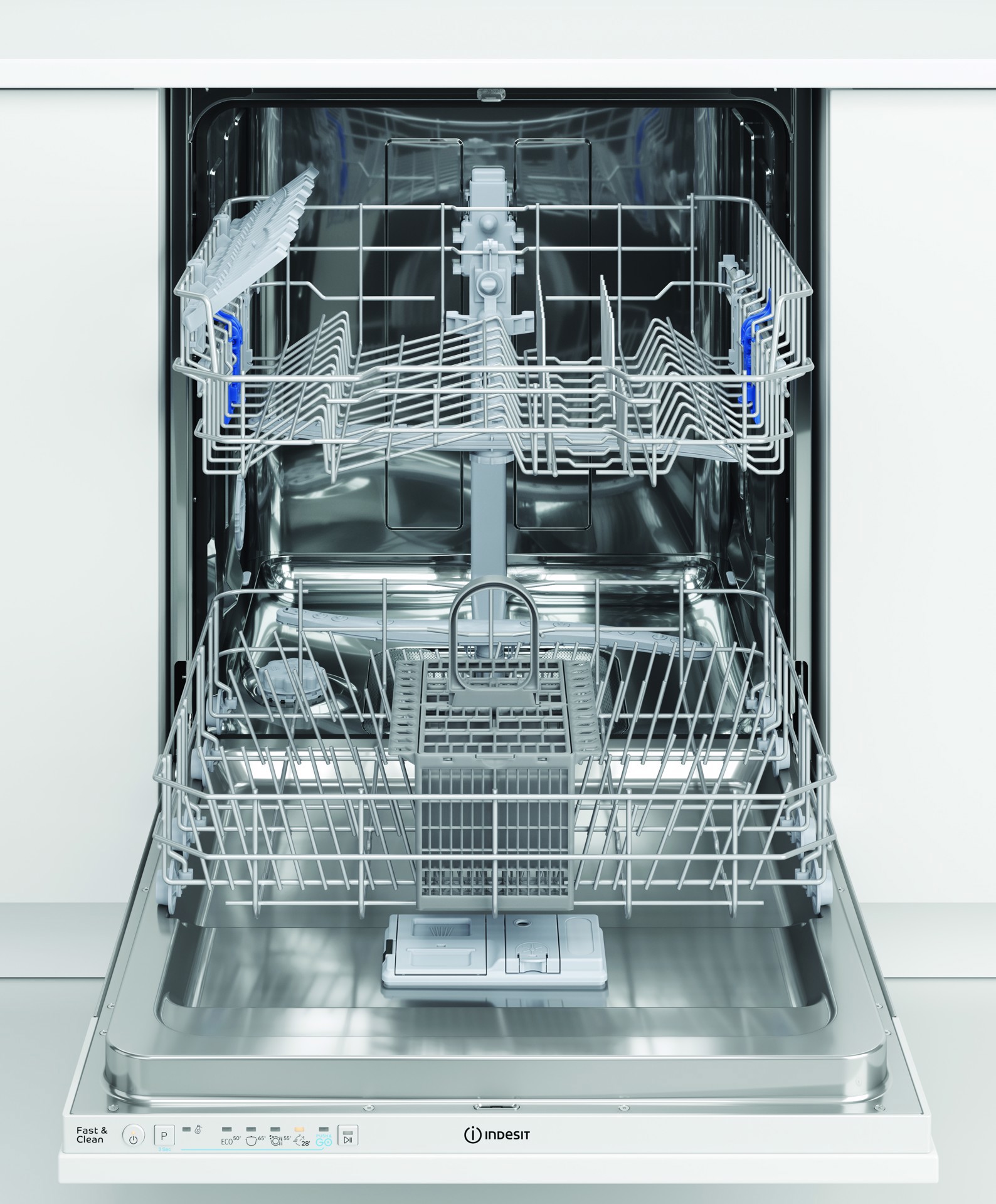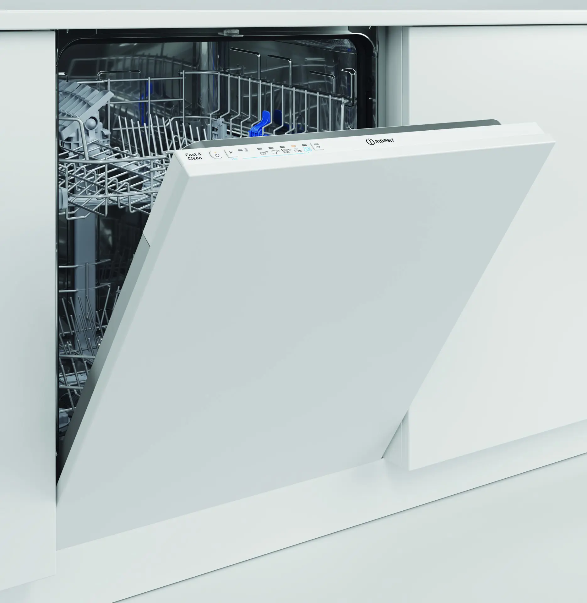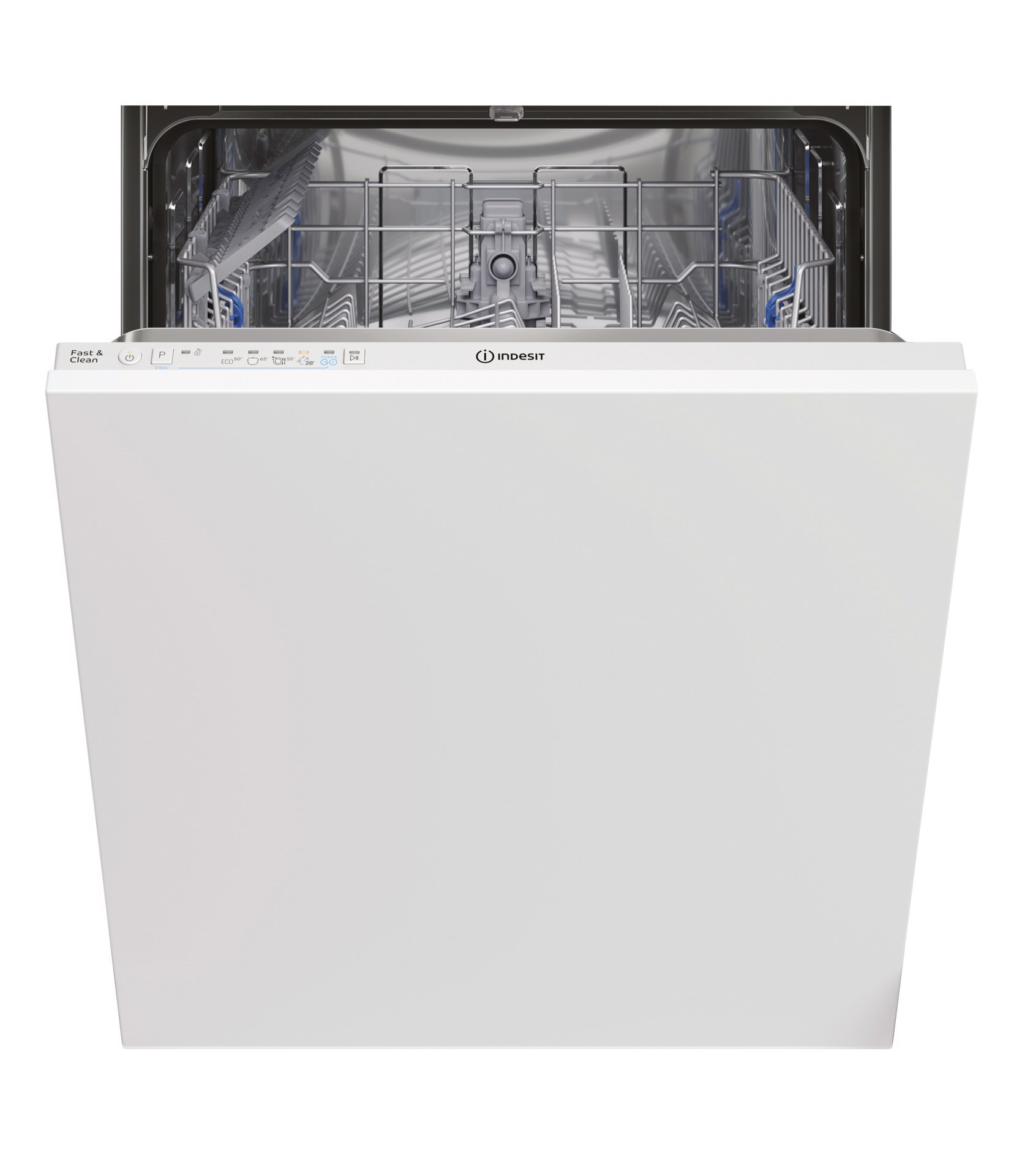 Indesit Lavastoviglie BI 60 cm, classe E, 14 coperti, Push&Go. Posizionamento dell'apparecchio: A scomparsa totale, Dimensione: Dimensione massima (60 cm), Tipo di controllo: Pulsanti. Numero di coperti: 14 coperti, Classe emissione rumore: C, Emissione acustica: 49 dB. Classe efficienza energetica: E, Consumo di acqua per ciclo: 12 L, Consumo energetico per 100 cicli: 95 kWh. Larghezza: 598 mm, Profondità: 555 mm, Altezza: 820 mm. Larghezza imballo: 625 mm, Profondità imballo: 675 mm, Altezza imballo: 910 mm