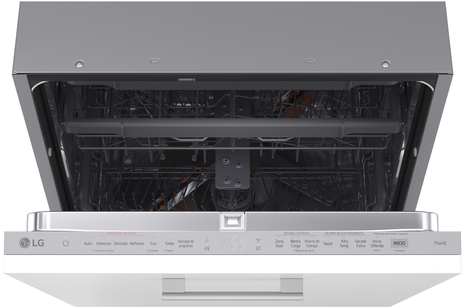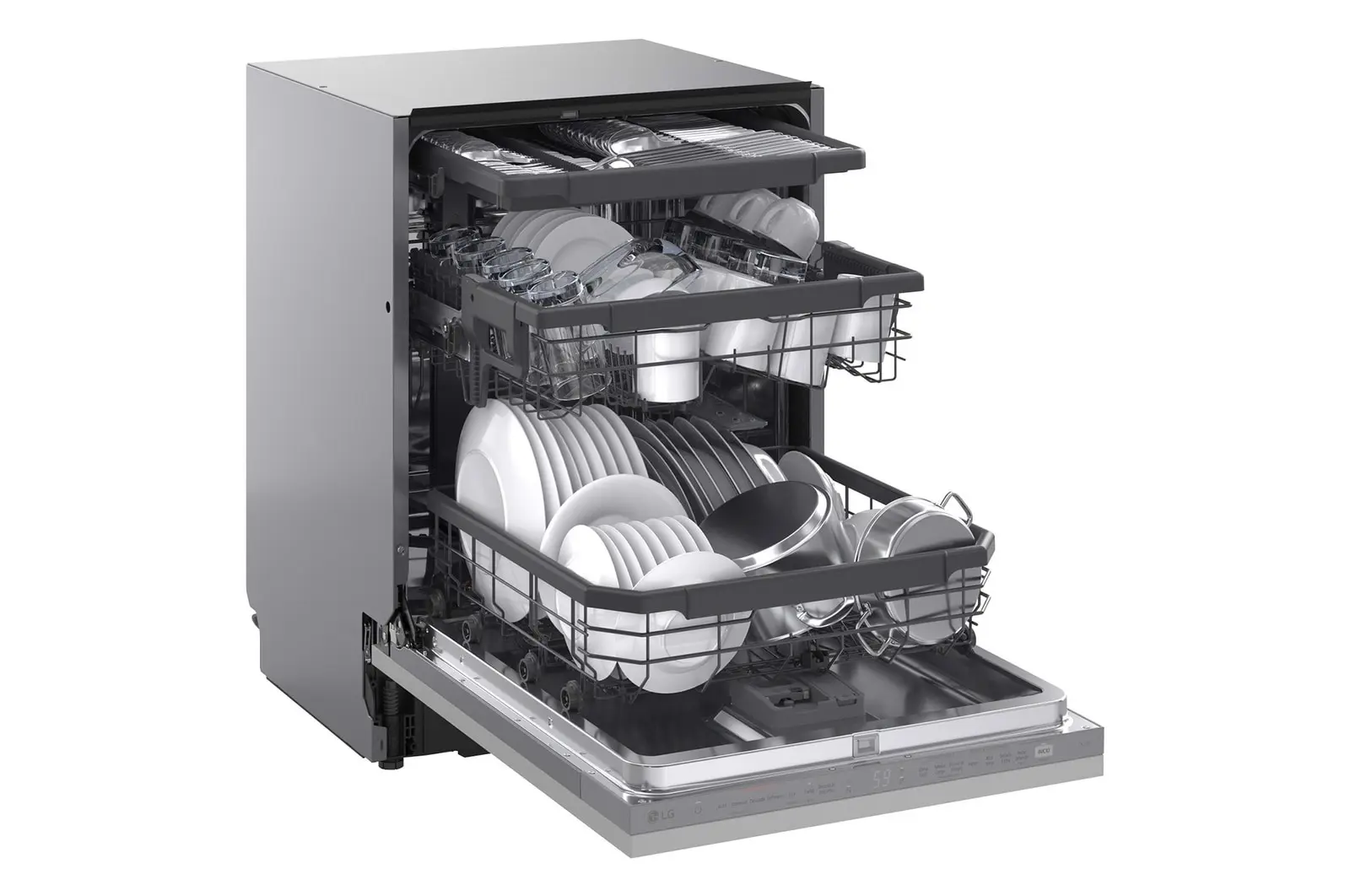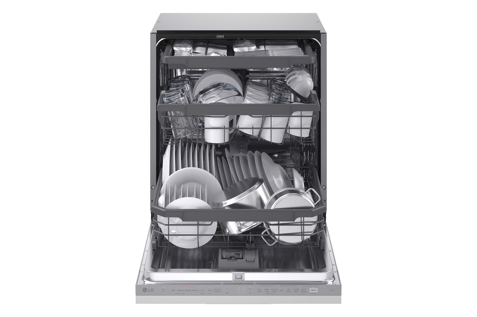 | Tecnologie LG (lavaggio stoviglie) | Apertura automatica a secco, DirectDrive Motor™, Dual Zone Wash, EasyRack™ Plus, Height Adjustable 3rd Rack, Inverter Direct Drive™, QuadWash™, Smart Rack+™, Smart diagnosis, ThinQ™, TrueSteam™, Turbo cycle |