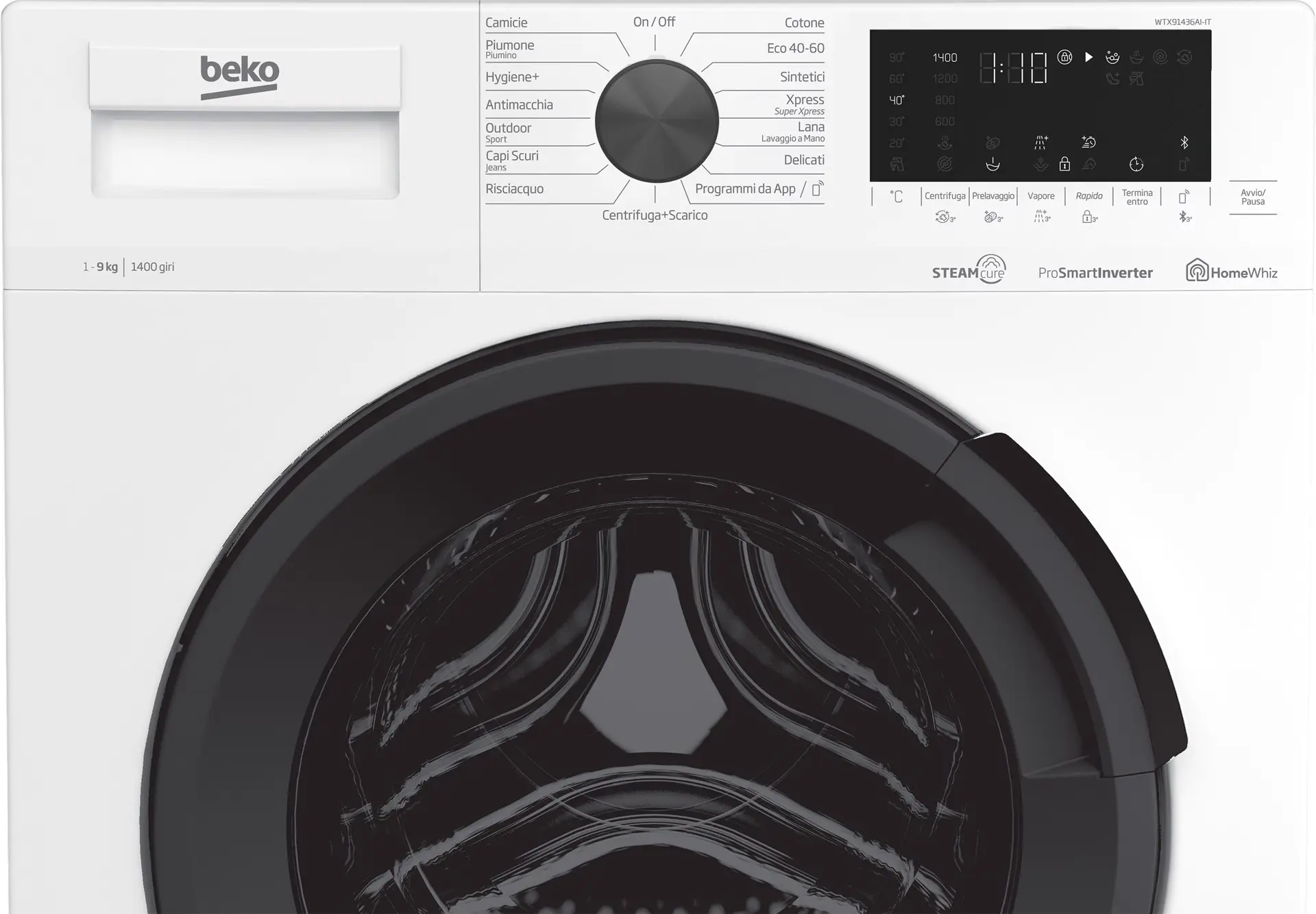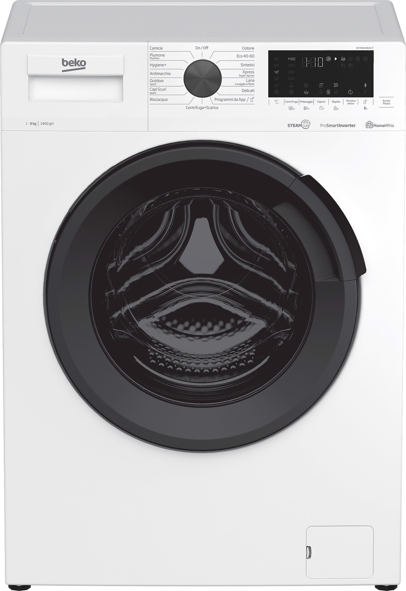 Beko WTX91436AI-IT. Tipo di carica: Caricamento frontale. Capacità cestello: 9 kg, Classe di efficienza della centrifuga: B, Silenziosità (centrifuga): 74 dB, Velocità di centrifuga massima: 1400 Giri/min. Colore del prodotto: Bianco. Larghezza: 600 mm, Profondità: 600 mm, Altezza: 840 mm. Classe efficienza energetica: B