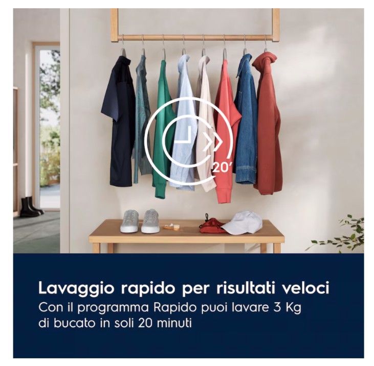 Il programma Rapido consente di lavare rapidamente i vestiti per una pulizia veloce. In soli 20 minuti puoi lavare 3 kg di biancheria.