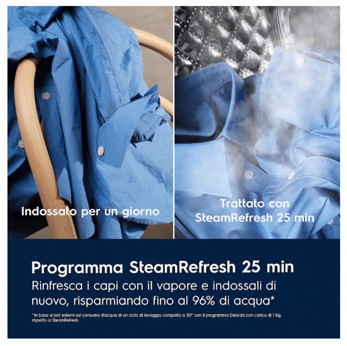 Il programma Vapore Refresh 25 min è adatto per capi delicati e ti permette di risparmiare fino al 96% di acqua rispetto al normale lavaggio. Per una sensazione ancora più fresca è possibile aggiungere Electrolux Steam Fragrance.