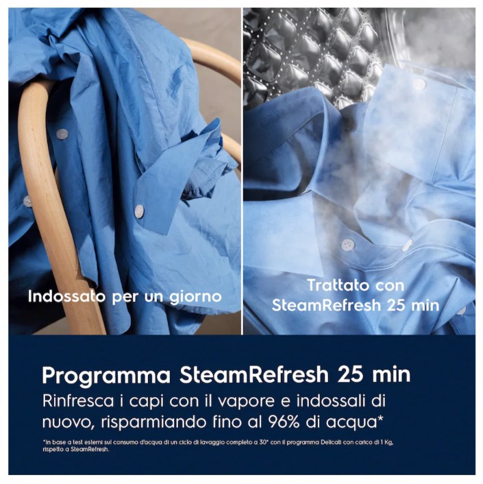 Il programma Vapore Refresh 25 min è adatto per capi delicati e ti permette di risparmiare fino al 96% di acqua rispetto al normale lavaggio. Per una sensazione ancora più fresca è possibile aggiungere Electrolux Steam Fragrance.