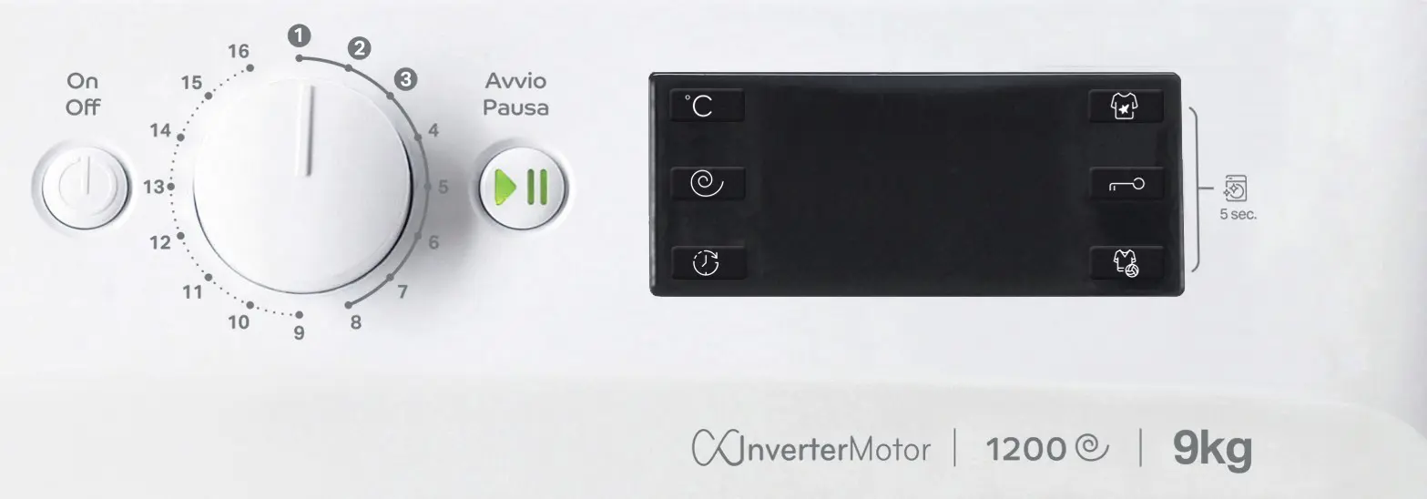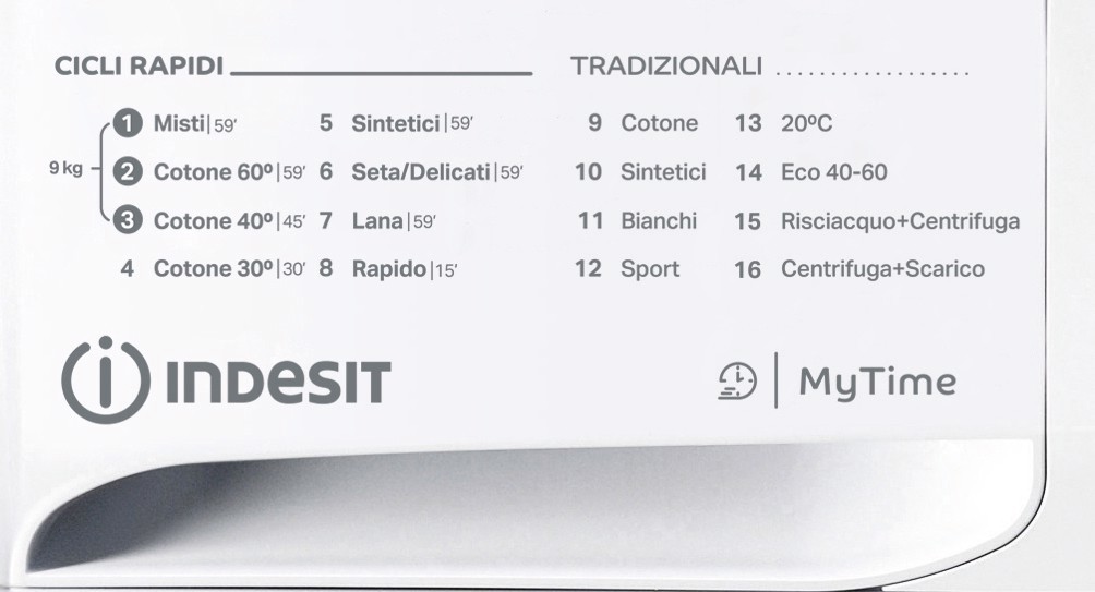 | Programmi di lavaggio | Cotone, Cotone 60 °C, Cotone 90 °C, Delicati/Seta, Eco, Mix, Rapido, Risciacquo e centrifuga, Centrifuga/scarico, Sport, Sintetico, Bianco, Lana |