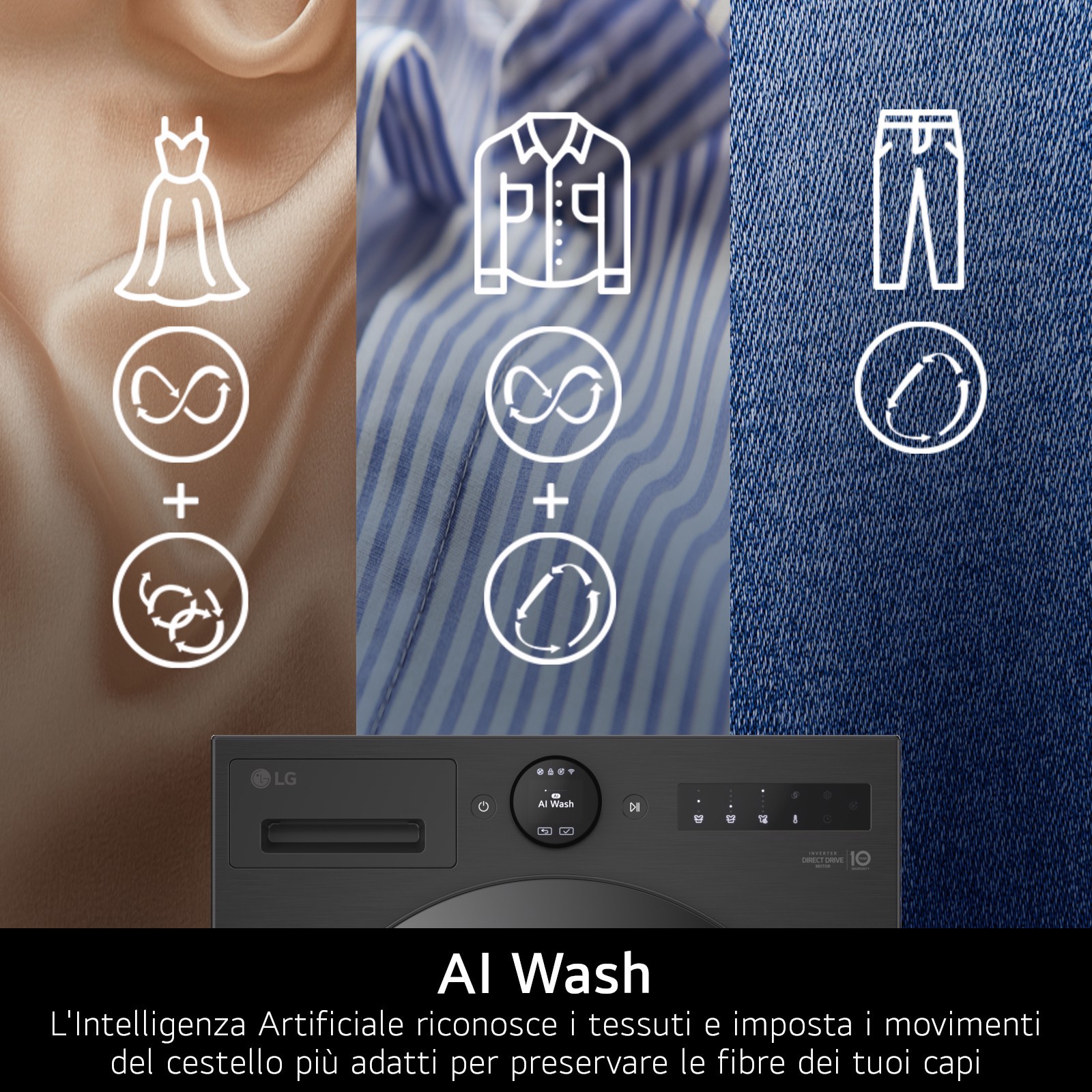 Grazie alla nostra tecnologia AI DD™ basata sul motore Direct Drive, il programma AI Wash riconosce la tipologia dei tessuti e sceglie i movimenti di lavaggio ottimali. In particolare, l'AI Wash permette di proteggere meglio i tessuti morbidi e di risparmiare energia. Così potrai indossare i tuoi capi preferiti più a lungo.