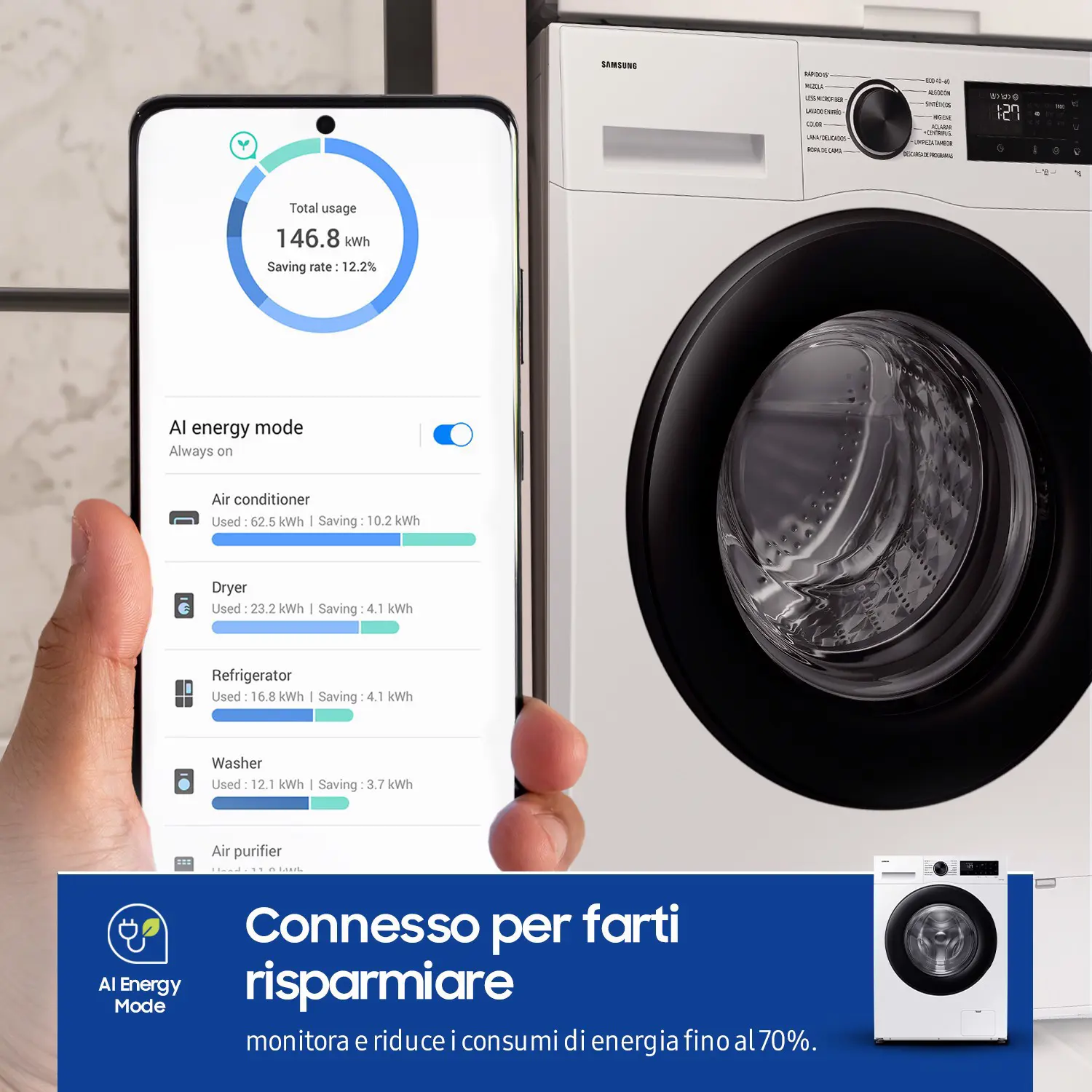 Tieni sotto controllo e riduci il consumo elettrico della tua lavatrice. Con AI Energy Mode[5] puoi verificare facilmente i consumi ed effettuare una stima della bolletta. In più, con lopzione Risparmio Massimo[6] , i consumi si riducono fino al 70%[7] grazie alla tecnologia Ecobubble™.